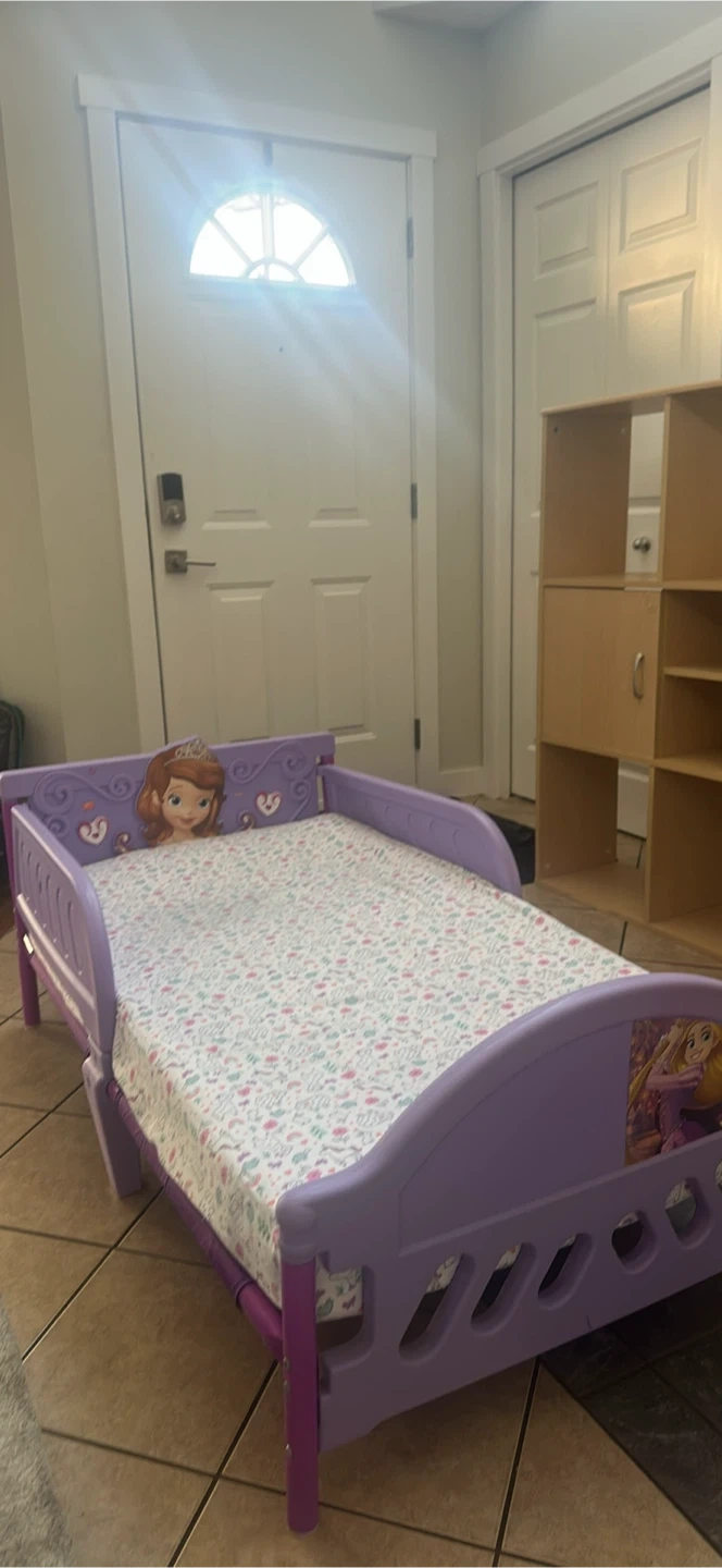 A cute purple toddler bed featuring Sofia the First and Rapunzel! Perfect for transitioning your little one from a crib to a bed. Mattress is included