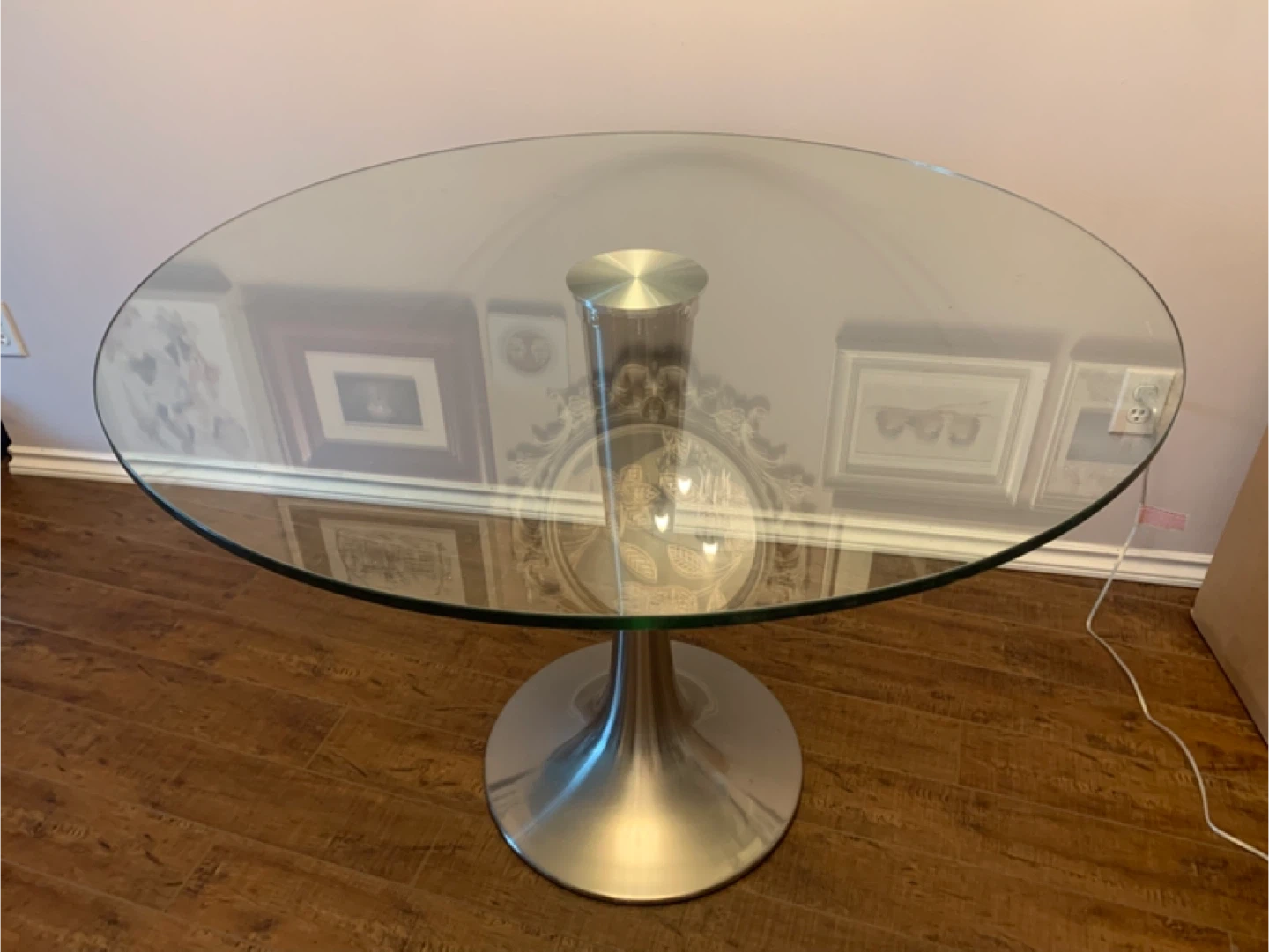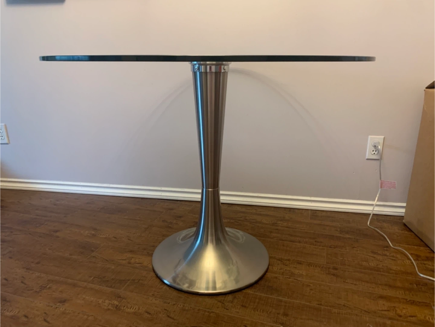 This is a modern glass top dining table with a sleek pedestal base. The round glass top is durable and easy to clean. It's a stylish addition to any dining space! Make an offer.