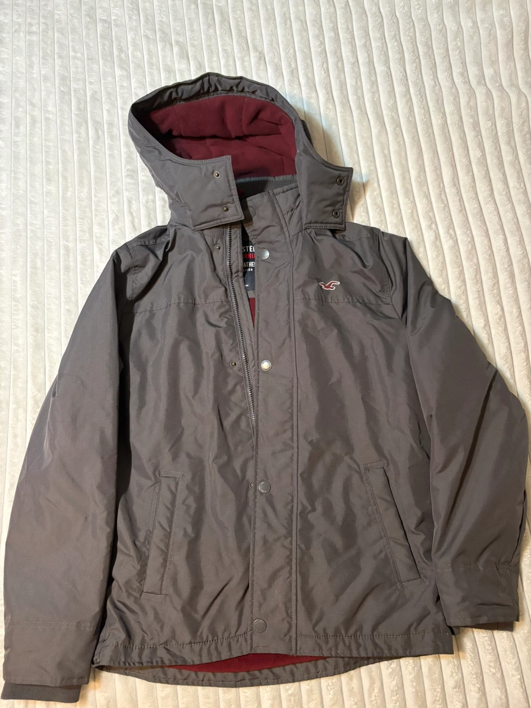 Hollister hooded winter jacket in grey. It's lined with a contrasting maroon fleece, great for spring!