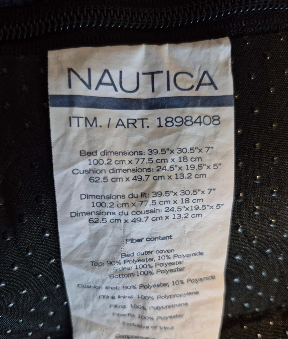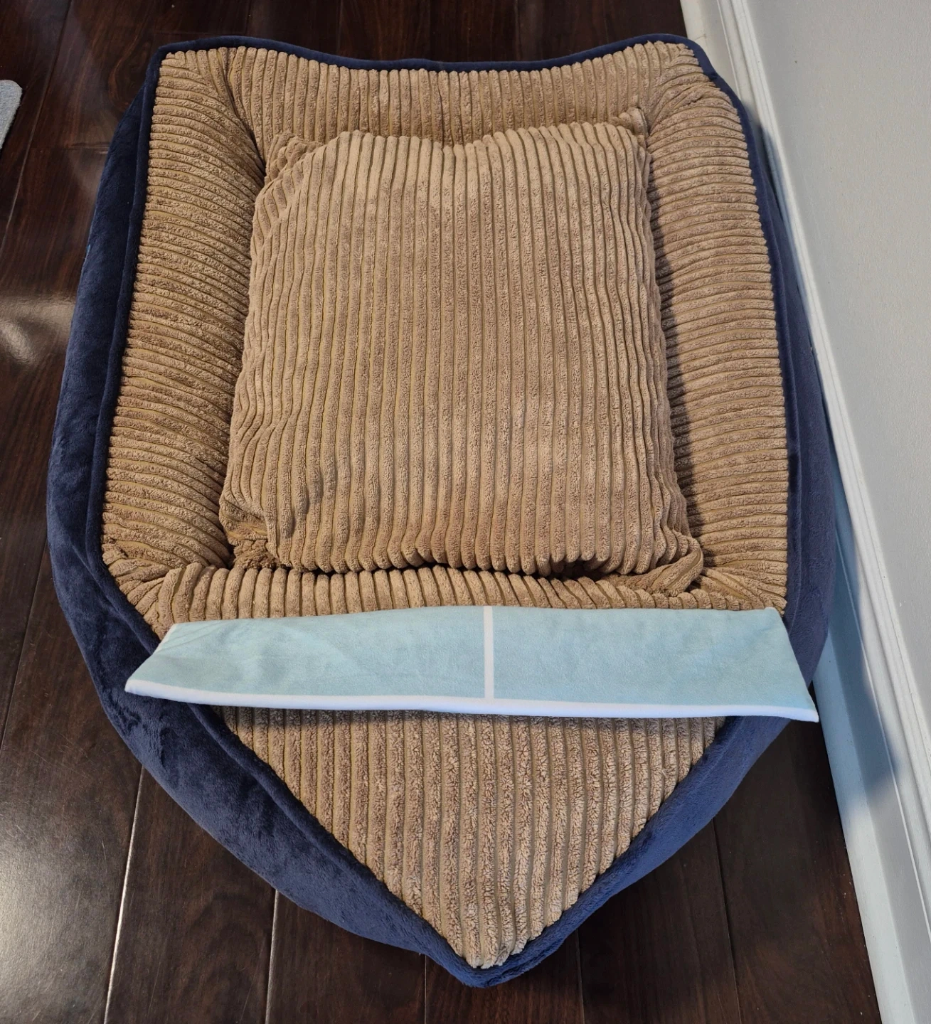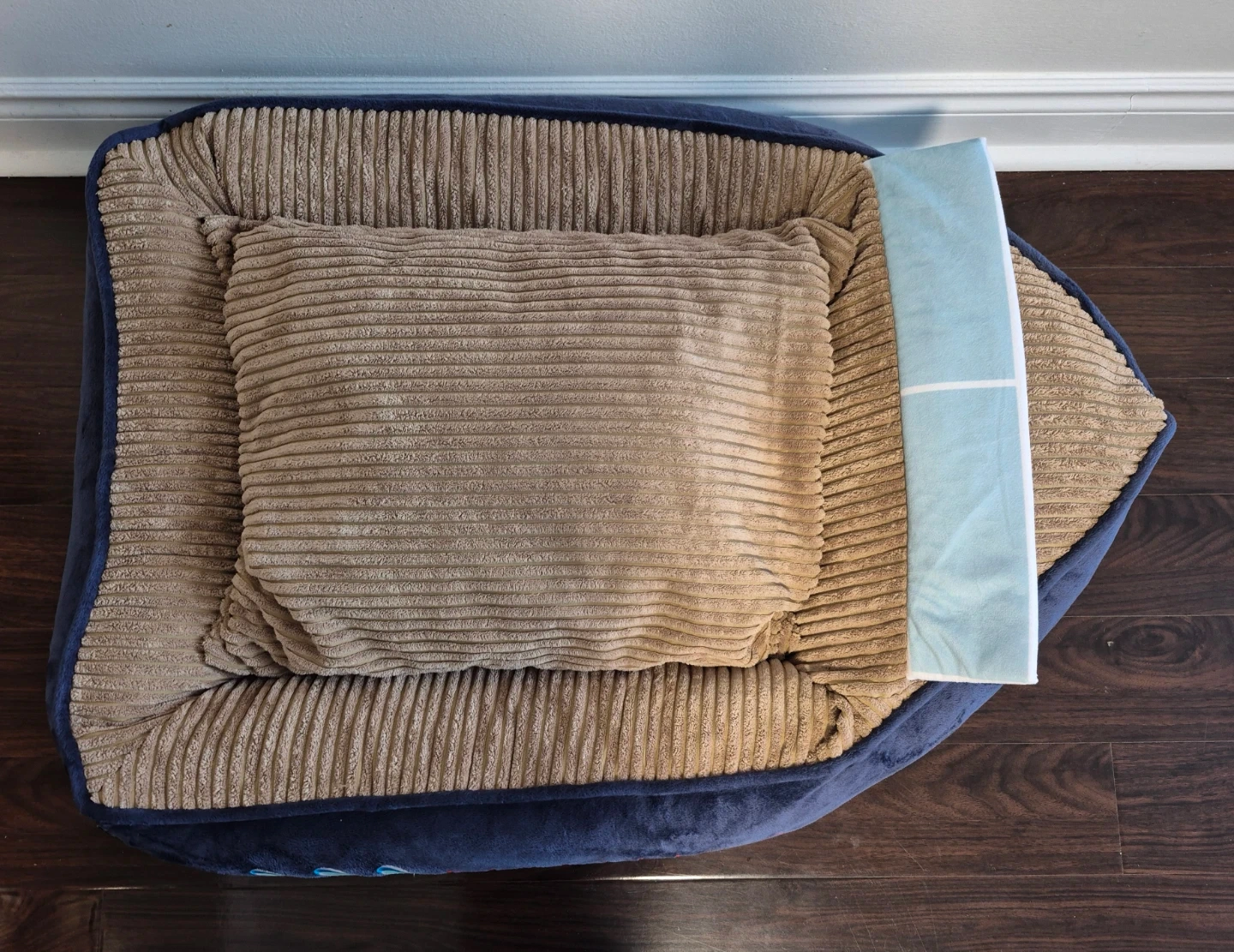 This comfortable Nautica pet bed comes in a navy blue exterior with a tan corduroy cushion.