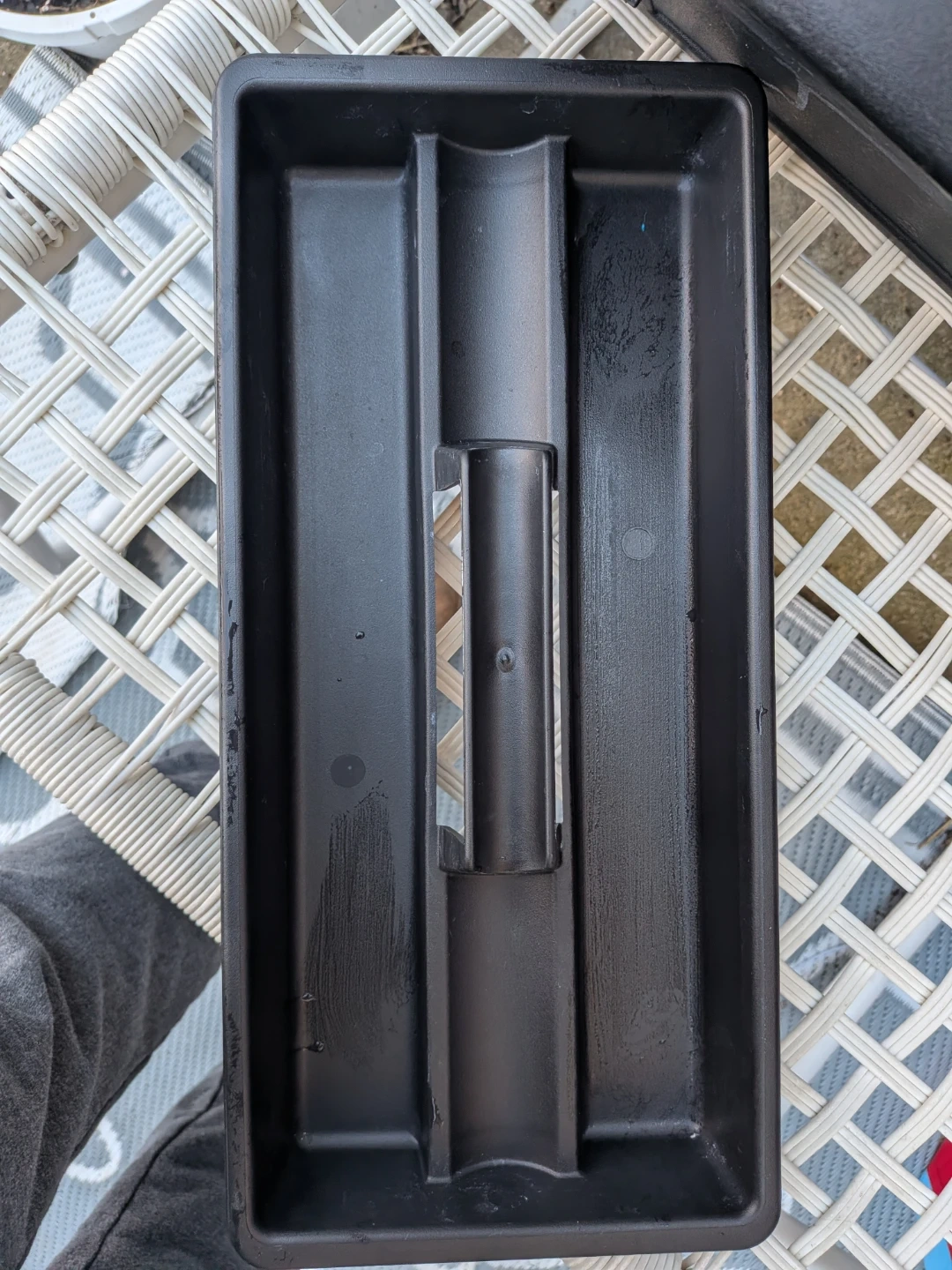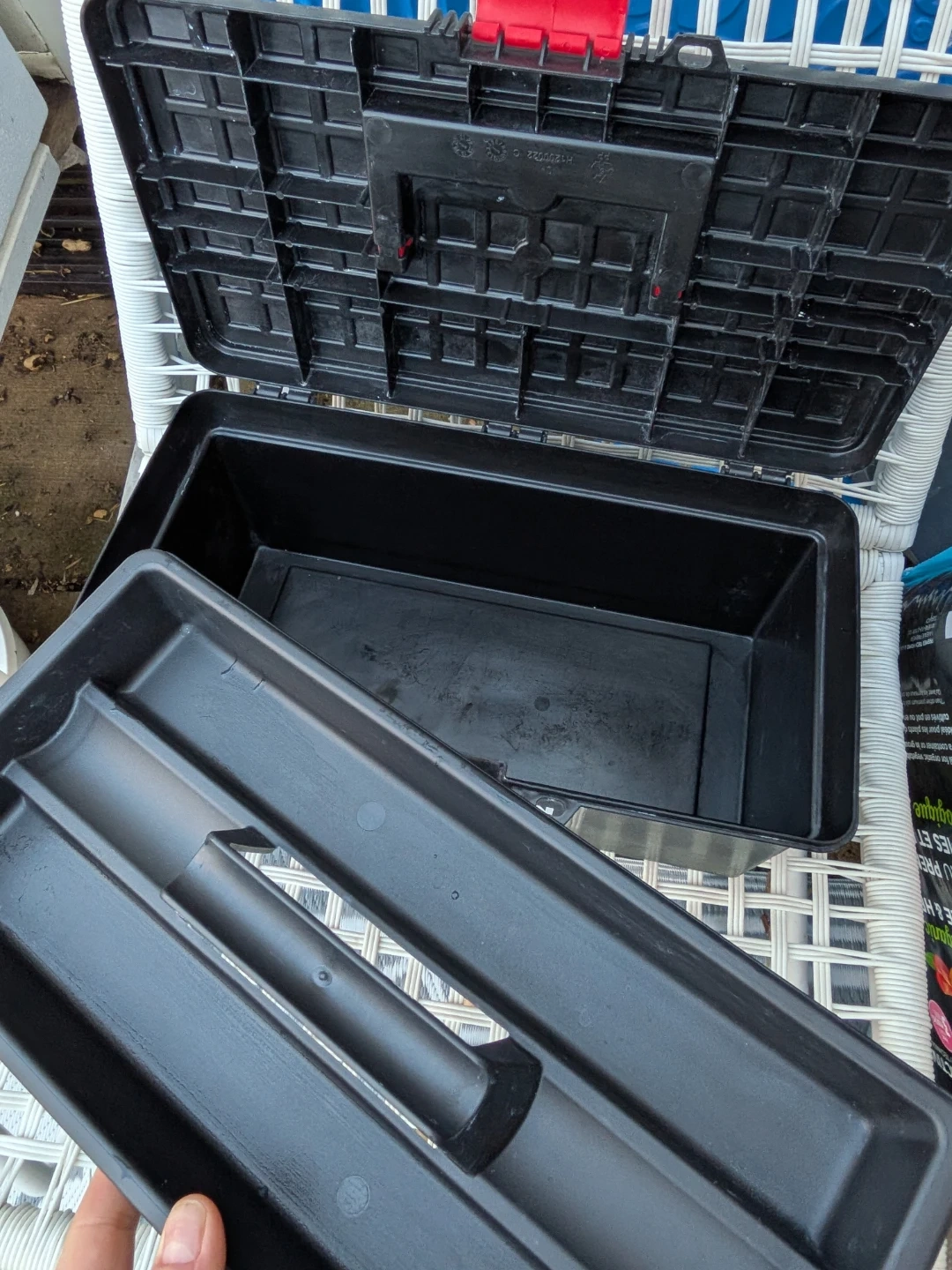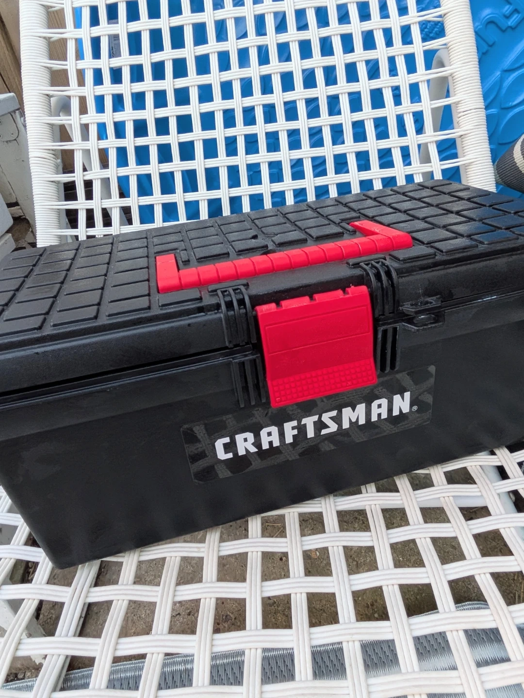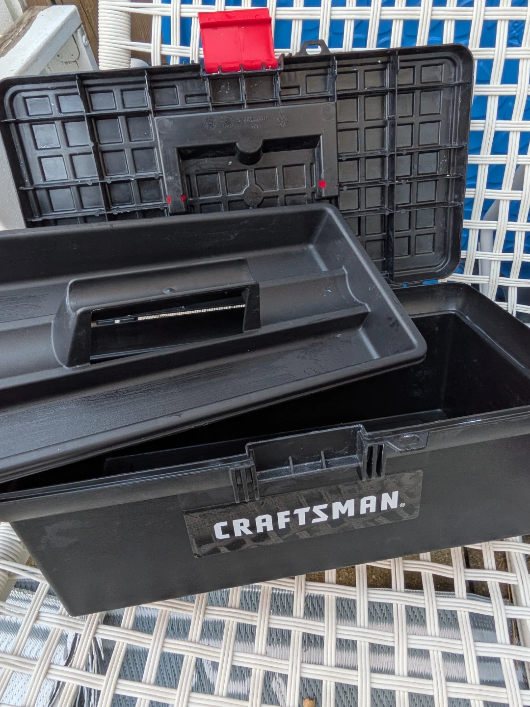 This is a black Craftsman tool box with a red latch. It includes a removable black tray for organization. A sturdy option for storing your tools!