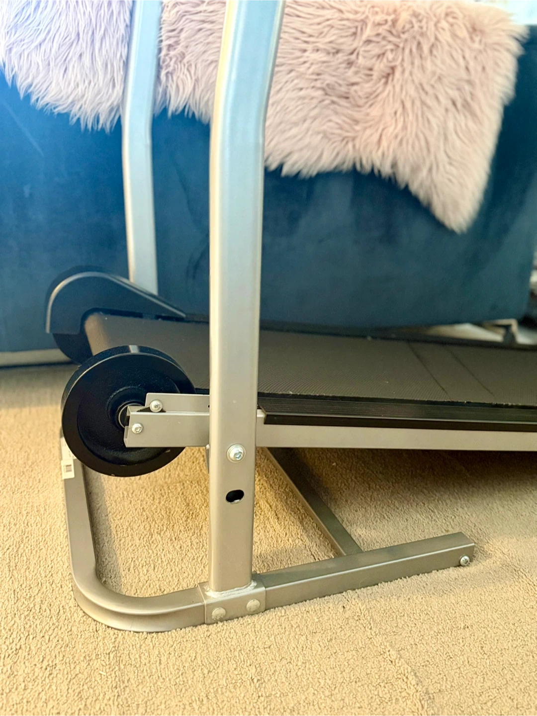 A compact treadmill suitable for walking or light jogging. It's made with a durable metal frame and a textured running belt. This treadmill is a great option for home workouts when space is limited!