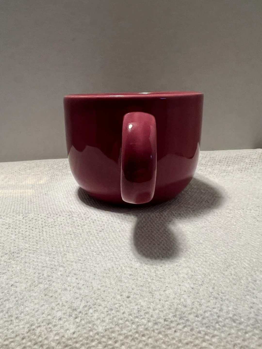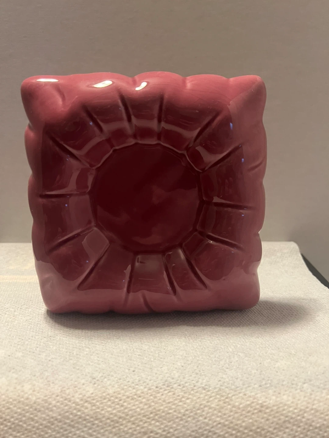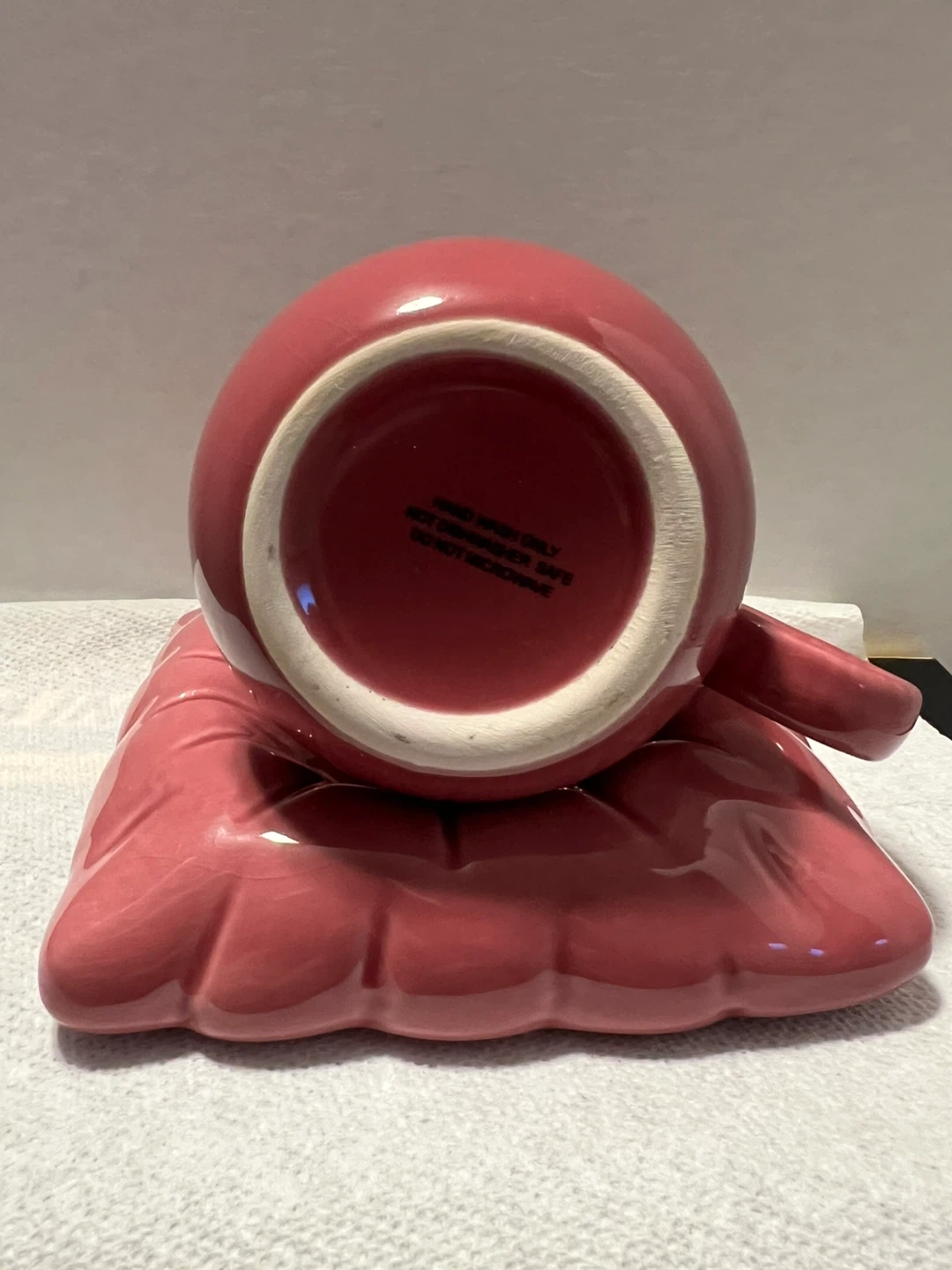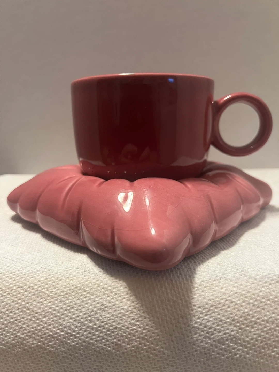 This is a ceramic drinkware set featuring a magenta mug and a matching square saucer designed to look like a tufted pillow. The cup has a capacity of approximately 10.4 ounces. Both pieces have a glossy glaze finish.