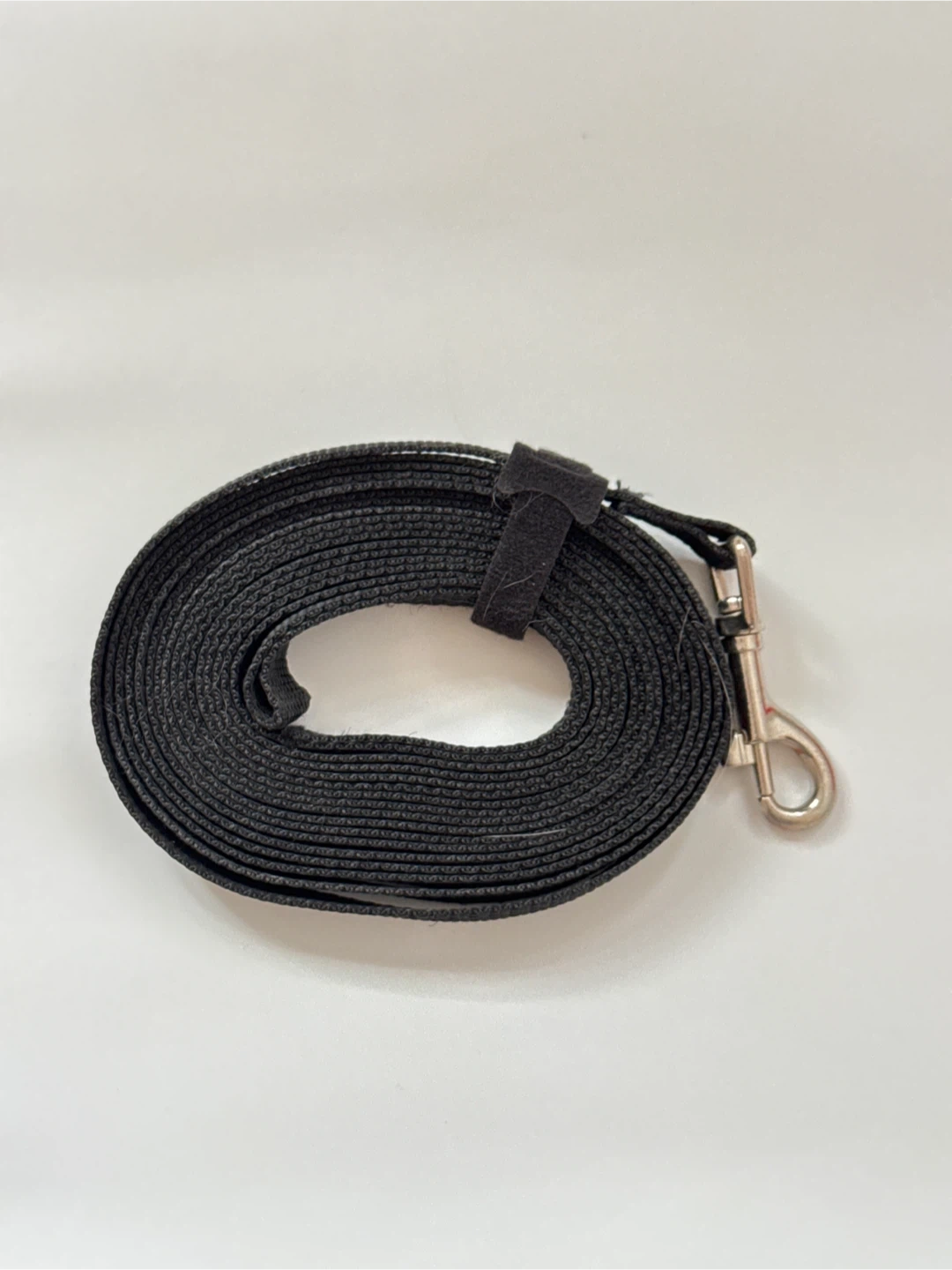 This is a black dog leash with a metal clip - 100meters in length. It's made of durable nylon material. A handy velcro strap keeps it neatly coiled. Someone might use this for daily dog walks.