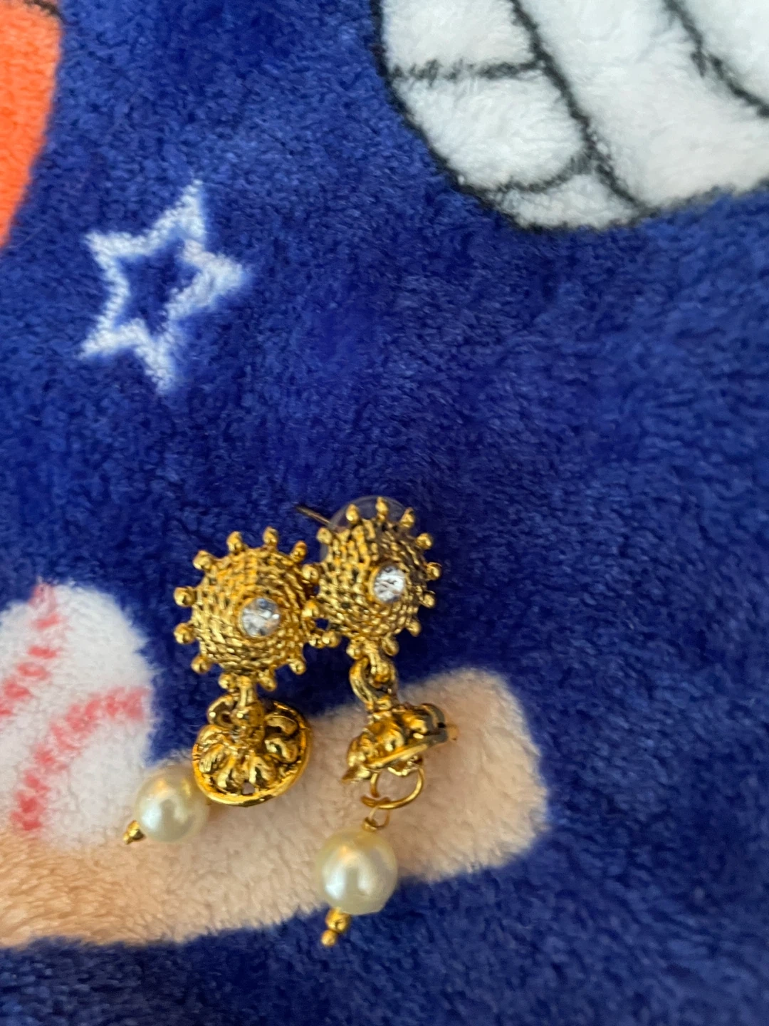 Beautiful gold-tone drop earrings featuring a sunburst design with a clear stone and pearl accents. These earrings are lightweight and dangly, perfect for adding a touch of elegance to any outfit. They're approximately 1.5 inches long.