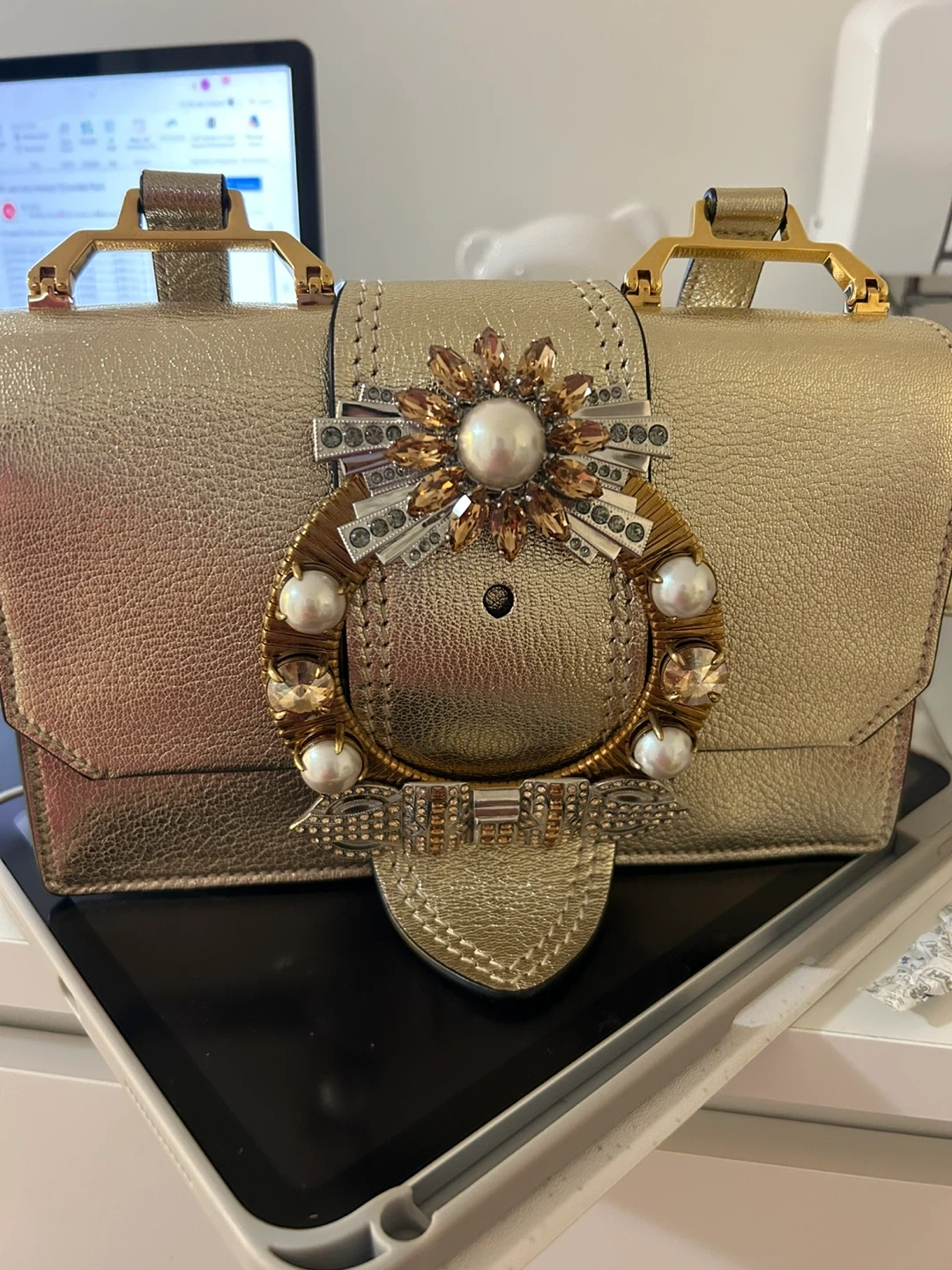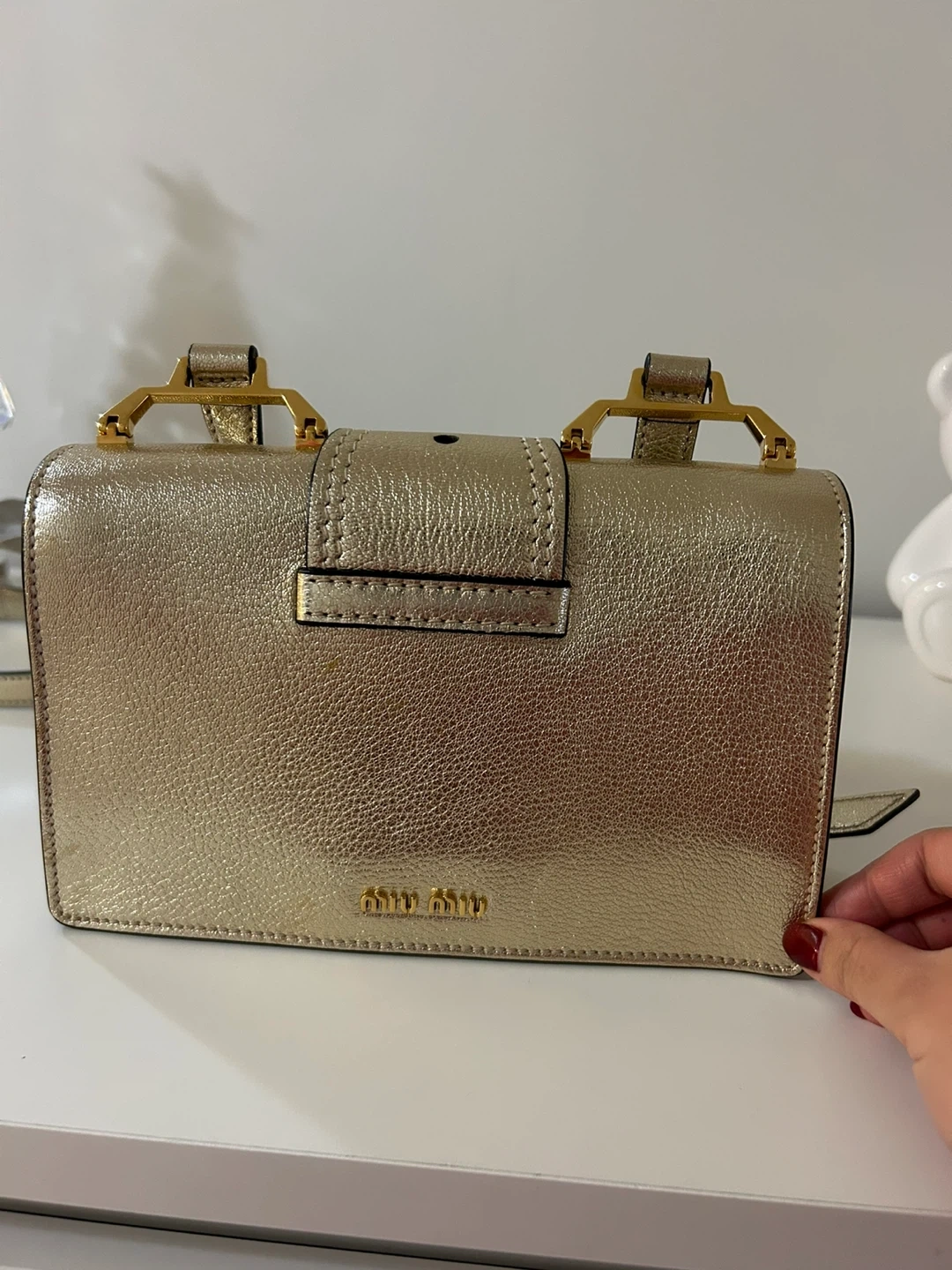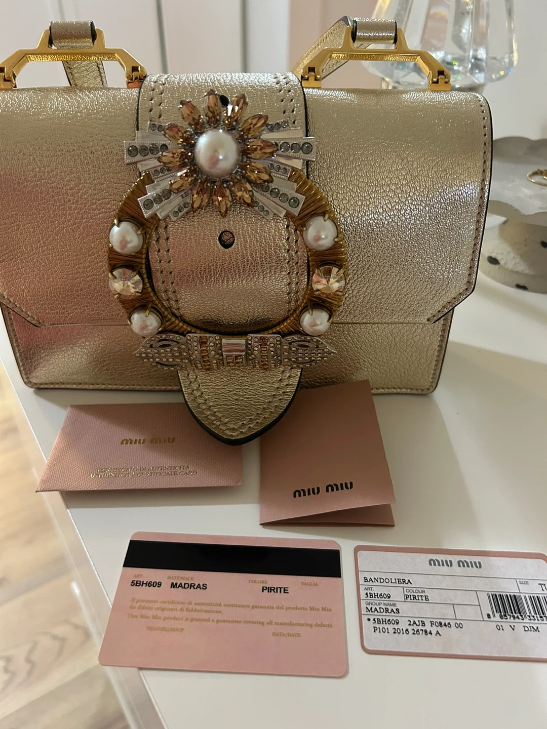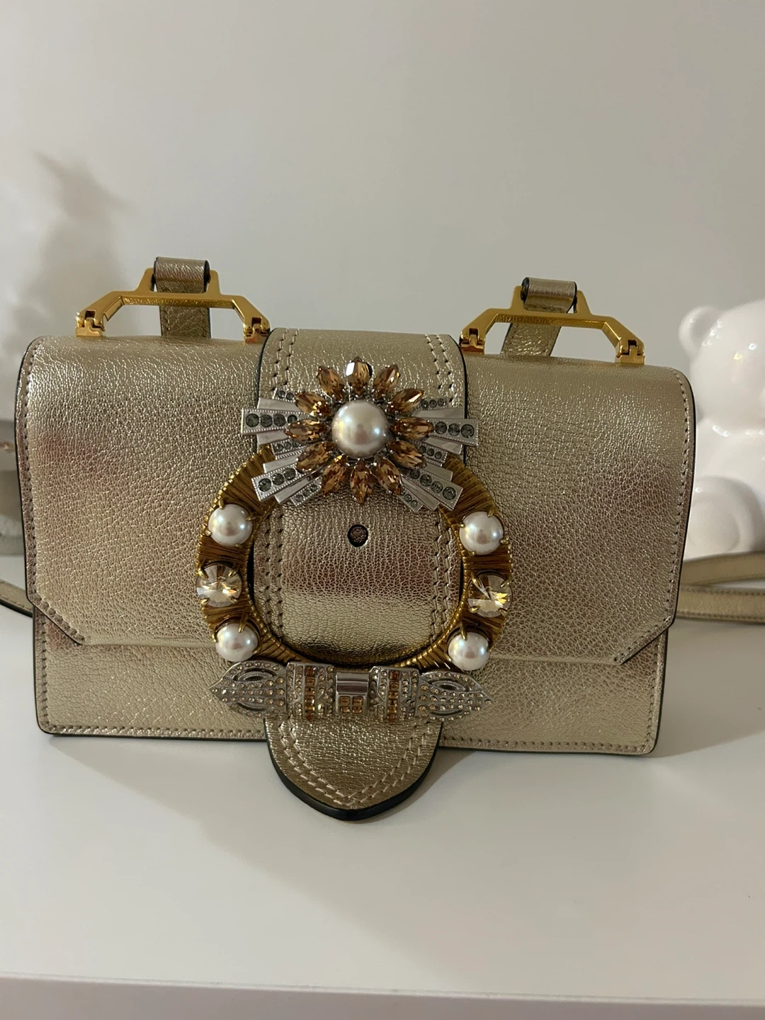 This is a Miu Miu Madras shoulder bag in a stunning gold colour. It's made in Italy and features a beautiful embellished clasp. The bag's dimensions are approximately 18cm wide, 10cm high, and 4cm deep. It's a chic accessory for any occasion!