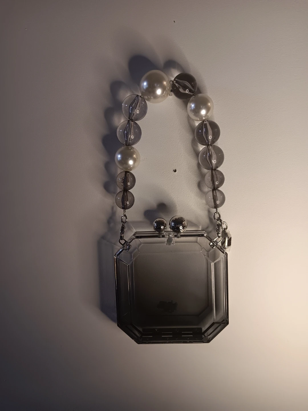 This unique clutch features a smoky grey acrylic octagonal shape with a distinctive handle made of pearl and clear beads. It's perfect for adding a statement piece to any outfit for a night out or special occasion. The closure is a secure clasp, and the acrylic construction offers a modern look.