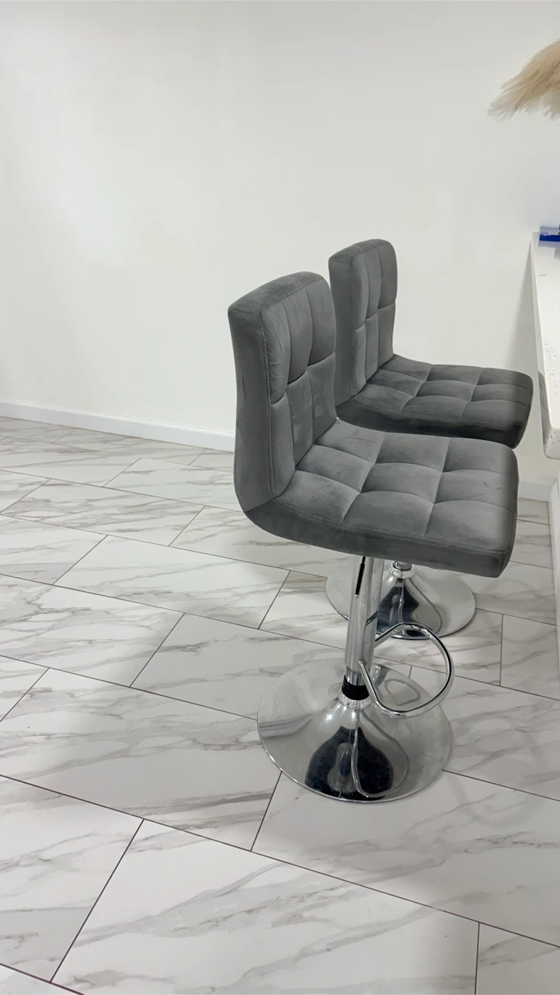 Selling a set of two gray velvet bar stools! They're in great condition and would look lovely in any kitchen or bar area. The stools feature a comfortable velvet seat and a sturdy chrome base. Easy to adjust the height to your liking. Perfect for adding a touch of elegance to your home!