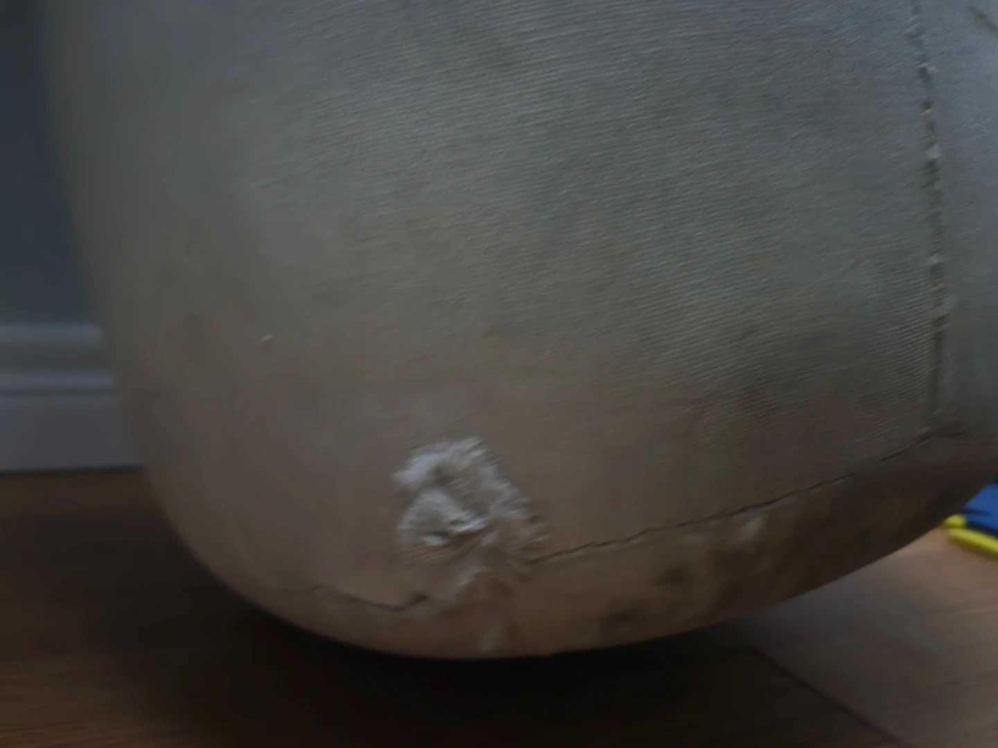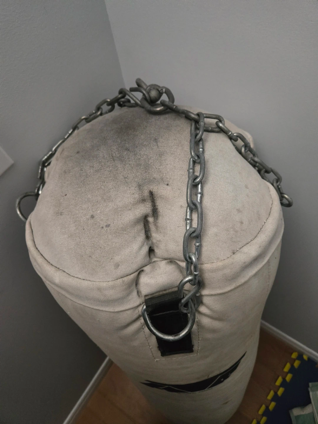 This is an AVF punching bag from Montreal, Canada. It's made of durable canvas and comes with a metal chain for hanging. There are signs of wear, including some marks and small tears on the material, but it's still ready for training.