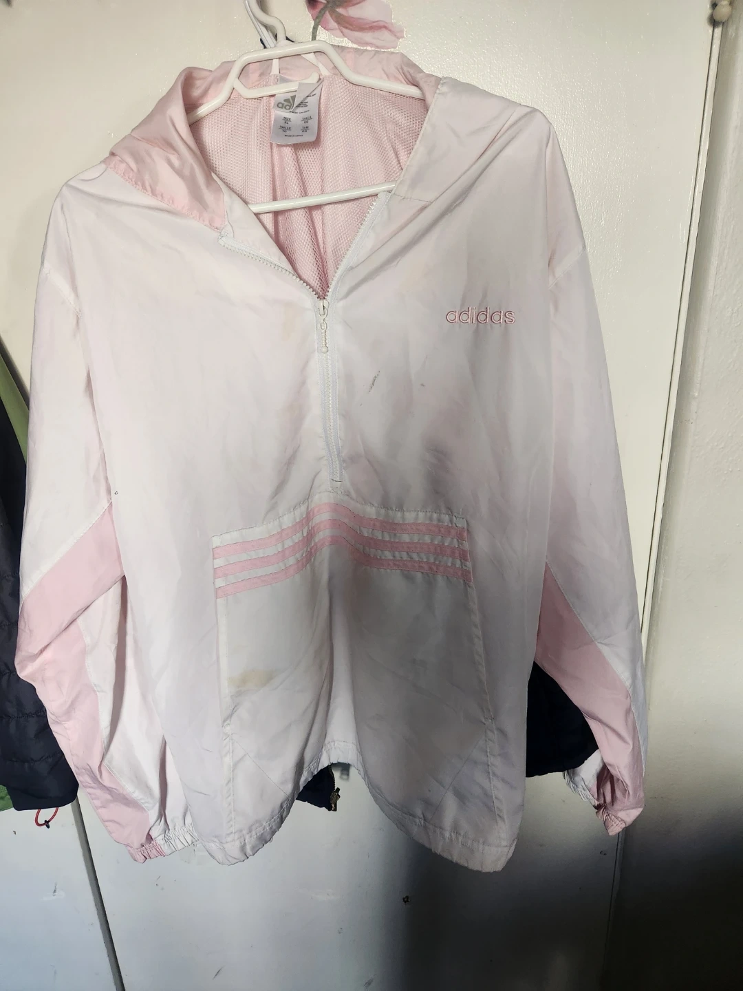 White and pink Adidas windbreaker jacket with the classic three stripes. It's a pullover style with a half-zip and a hood. Some minor stains are visible on the front.