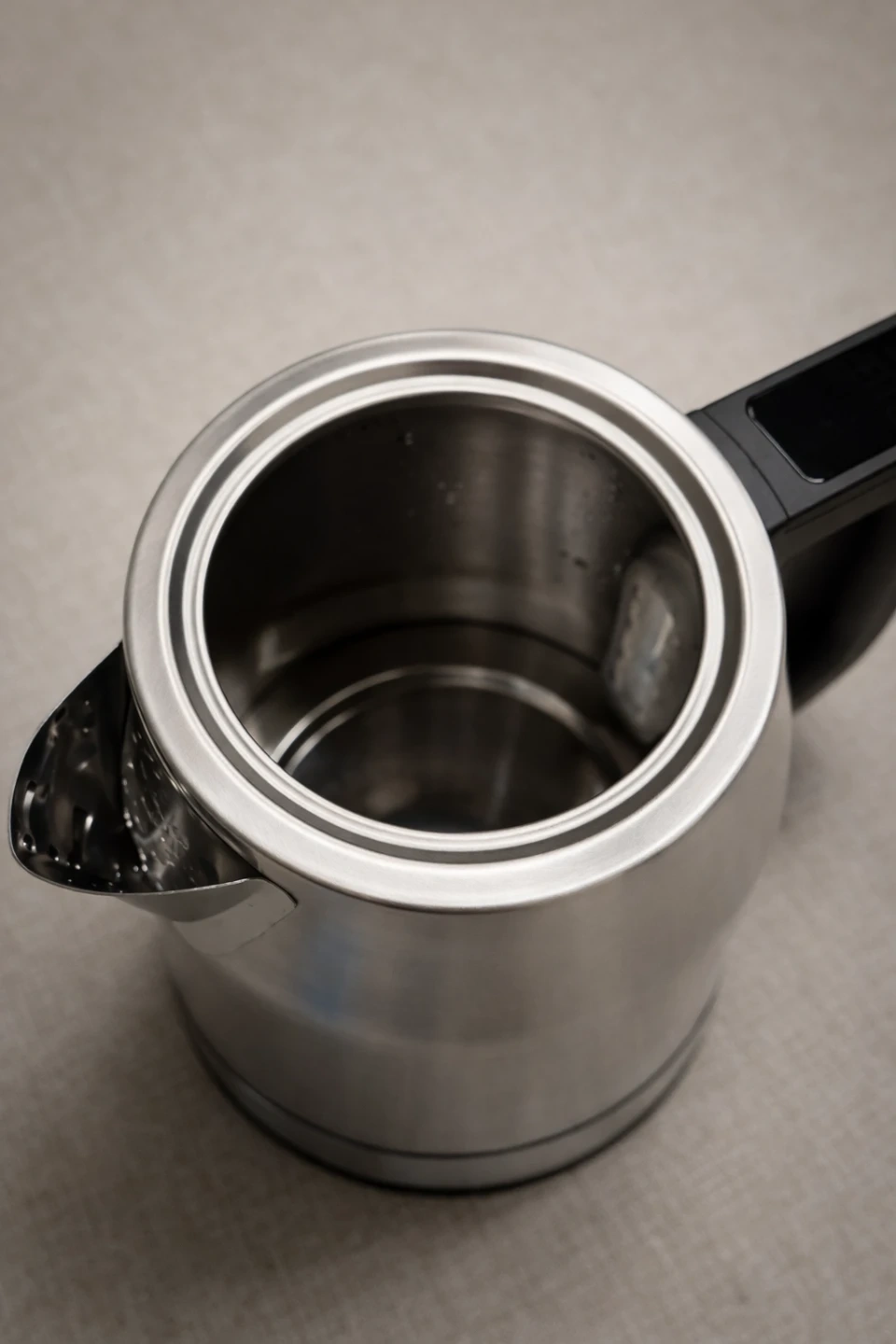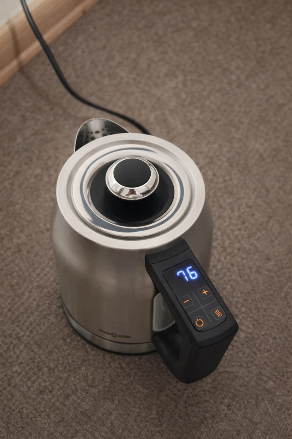 Stainless steel electric kettle with temperature control. Features a digital display on the handle to show the current temperature. Corded electric base included. This kettle is great for making tea or coffee.