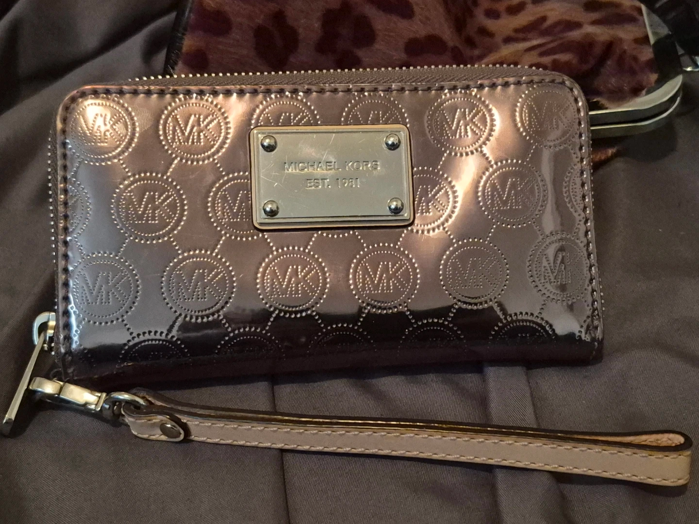 Shiny/reflective/metallic wallet in gold, with embossed MK logos. It's a zip-around style with a wrist strap. Plenty of card slots inside!