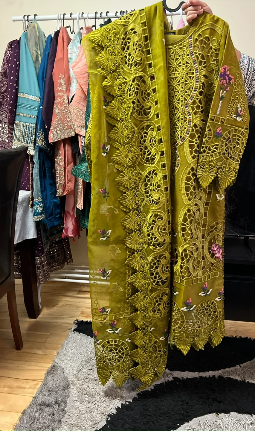 Maria B inspired beautiful Dhani color 3 pcs embroidered and cutwork suit with a beautiful cutwork embroidered dupatta. Size: Medium. Price: $135. Pickup/Delivery available.