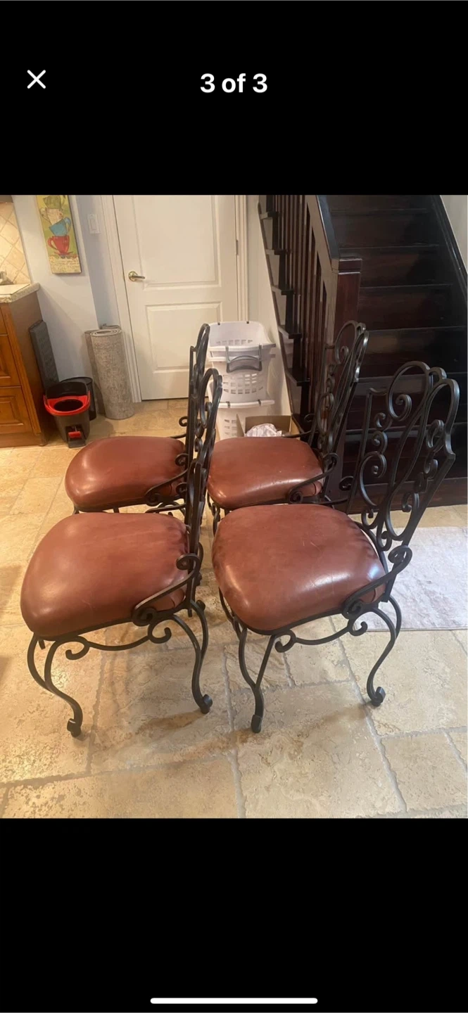 Charming set of four wrought iron dining chairs. Each chair features a padded seat upholstered in a rich, reddish-brown leather. The intricate scrollwork on the iron frames adds an elegant touch. These chairs would be a lovely addition to any dining space!