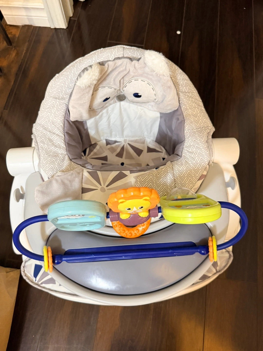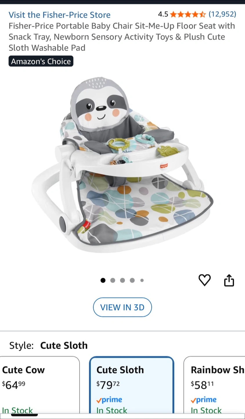 Fisher-Price Sit-Me-Up Floor Seat with multiple fun toys attached. Includes a snack tray for convenience. The plush sloth washable pad offers comfort for your little one.