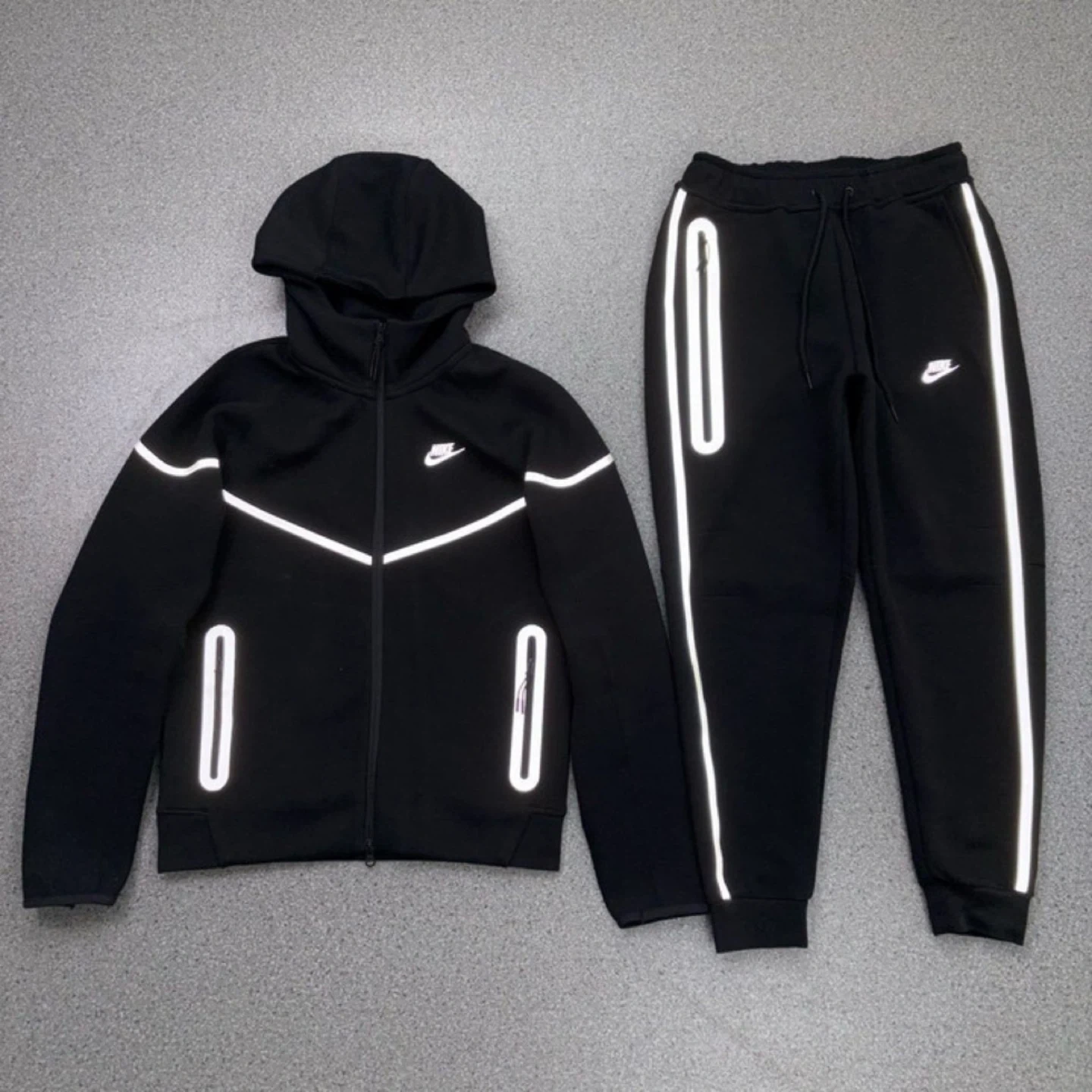 MENS Black Nike Tech Fleece tracksuit with reflective accents. Includes a full-zip hooded jacket and matching pants.