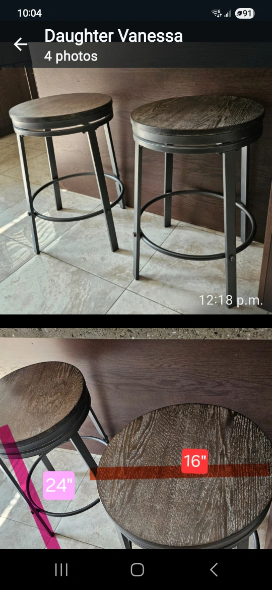 Selling a set of two bar stools! 2 in box and 2 outbox. They feature a sturdy metal frame with a wooden seat. They swivel The height is 24 inches and the seat diameter is 16 inches. Perfect for your kitchen island or bar area!