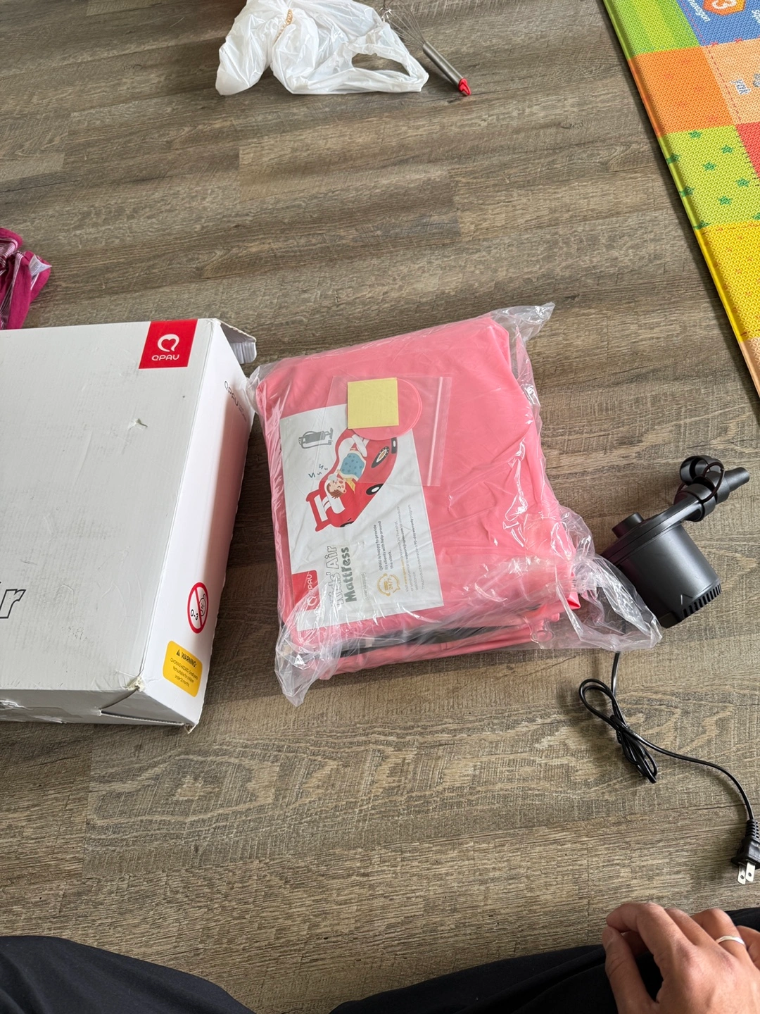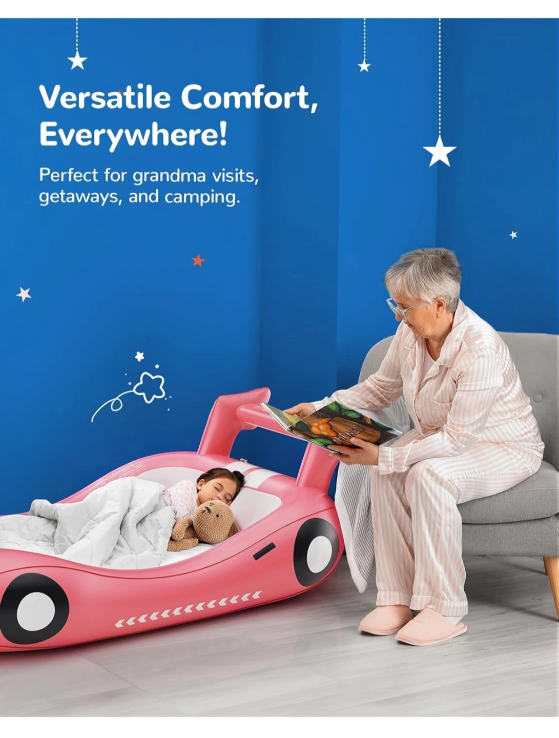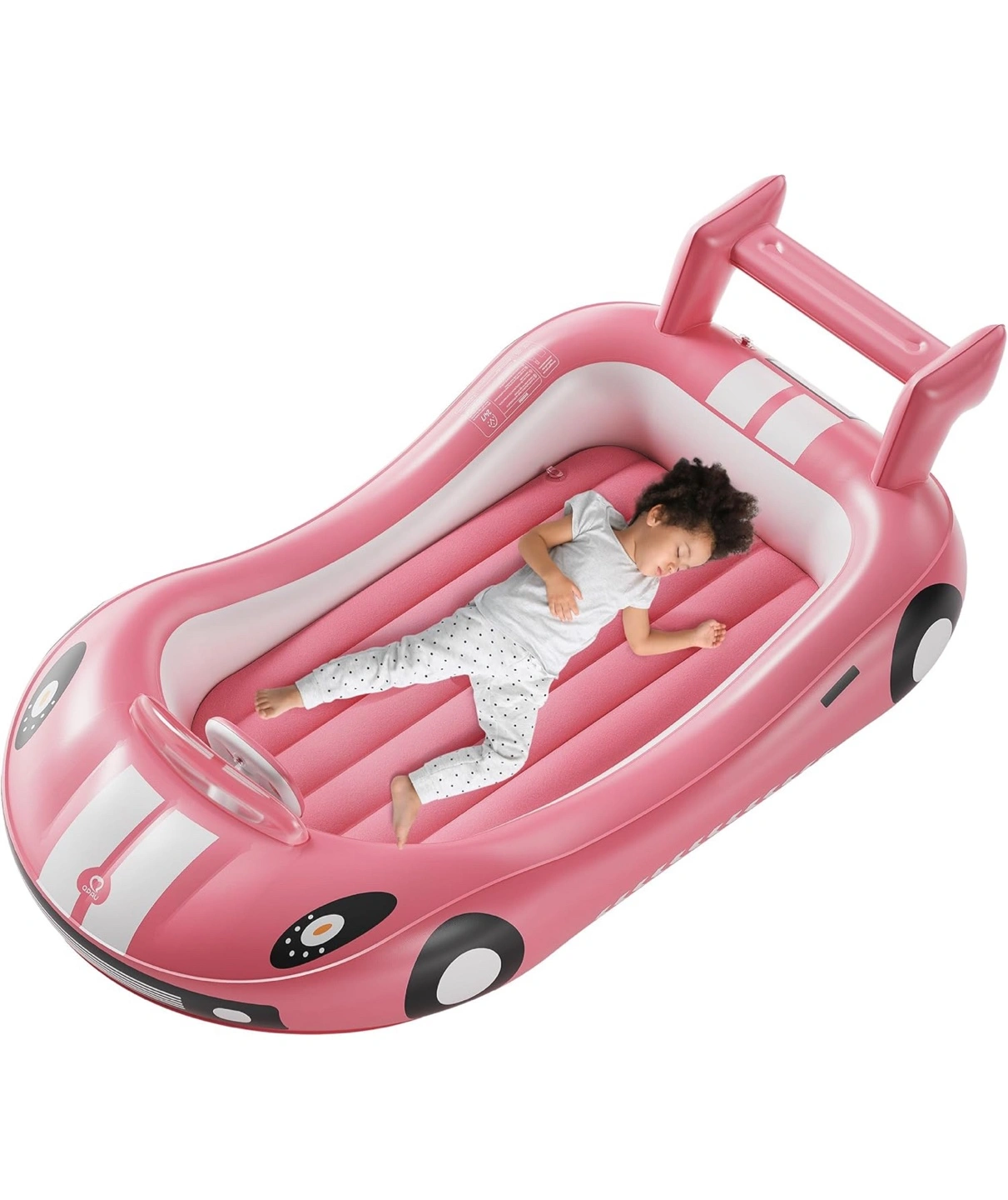This cute pink inflatable race car bed is perfect for toddlers! It's designed for cozy rest and playtime.