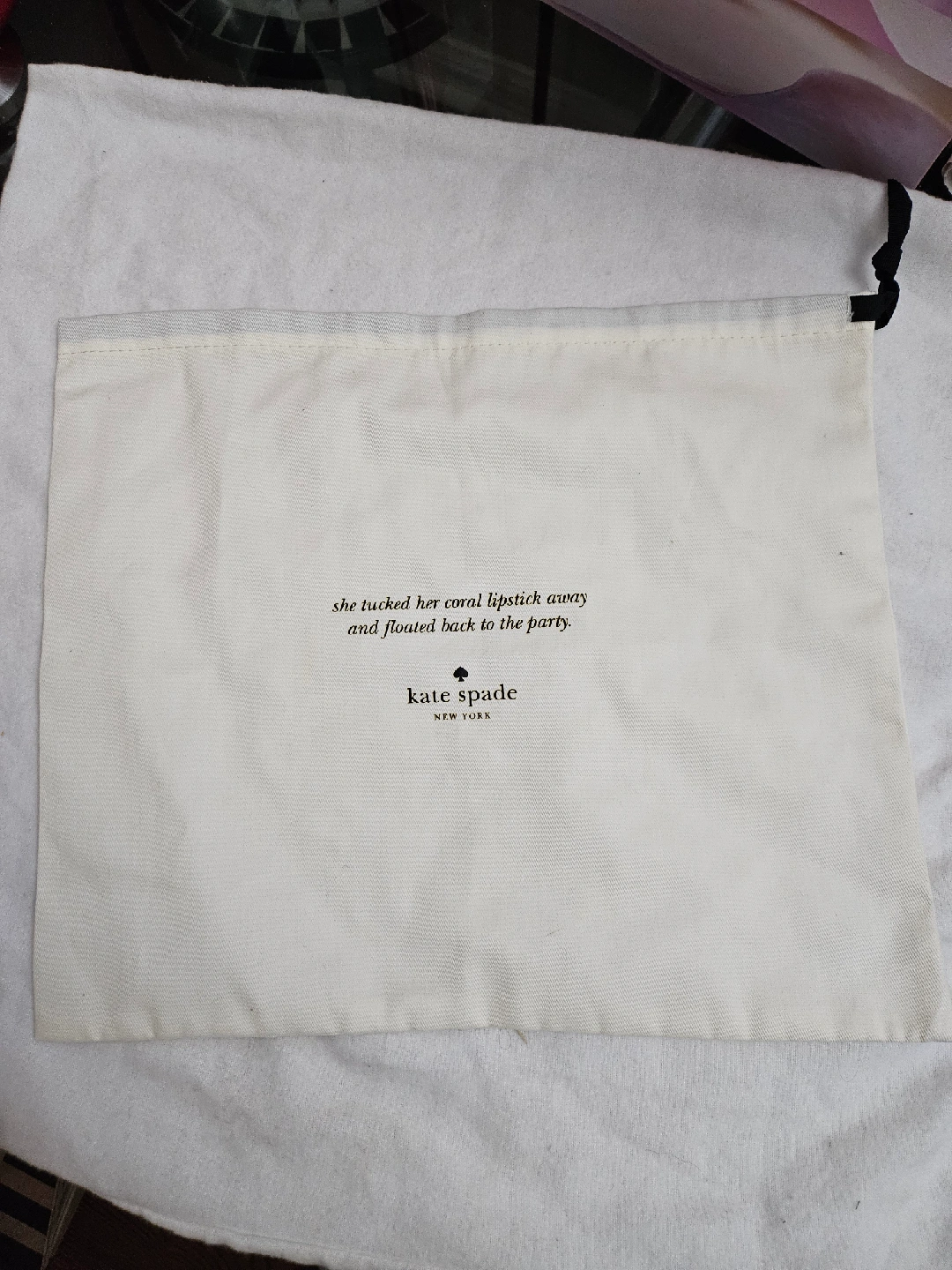 Selling a Kate Spade drawstring bag. It's in great condition and perfect for storing smaller items or using as a dust bag for a purse. The bag has the phrase "she tucked her coral lipstick away and floated back to the party" printed on it
