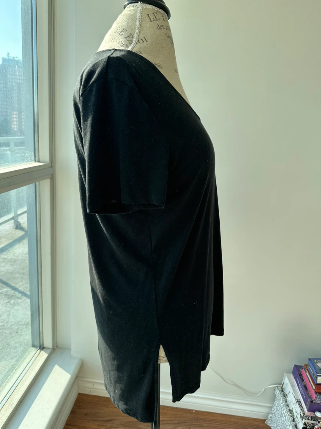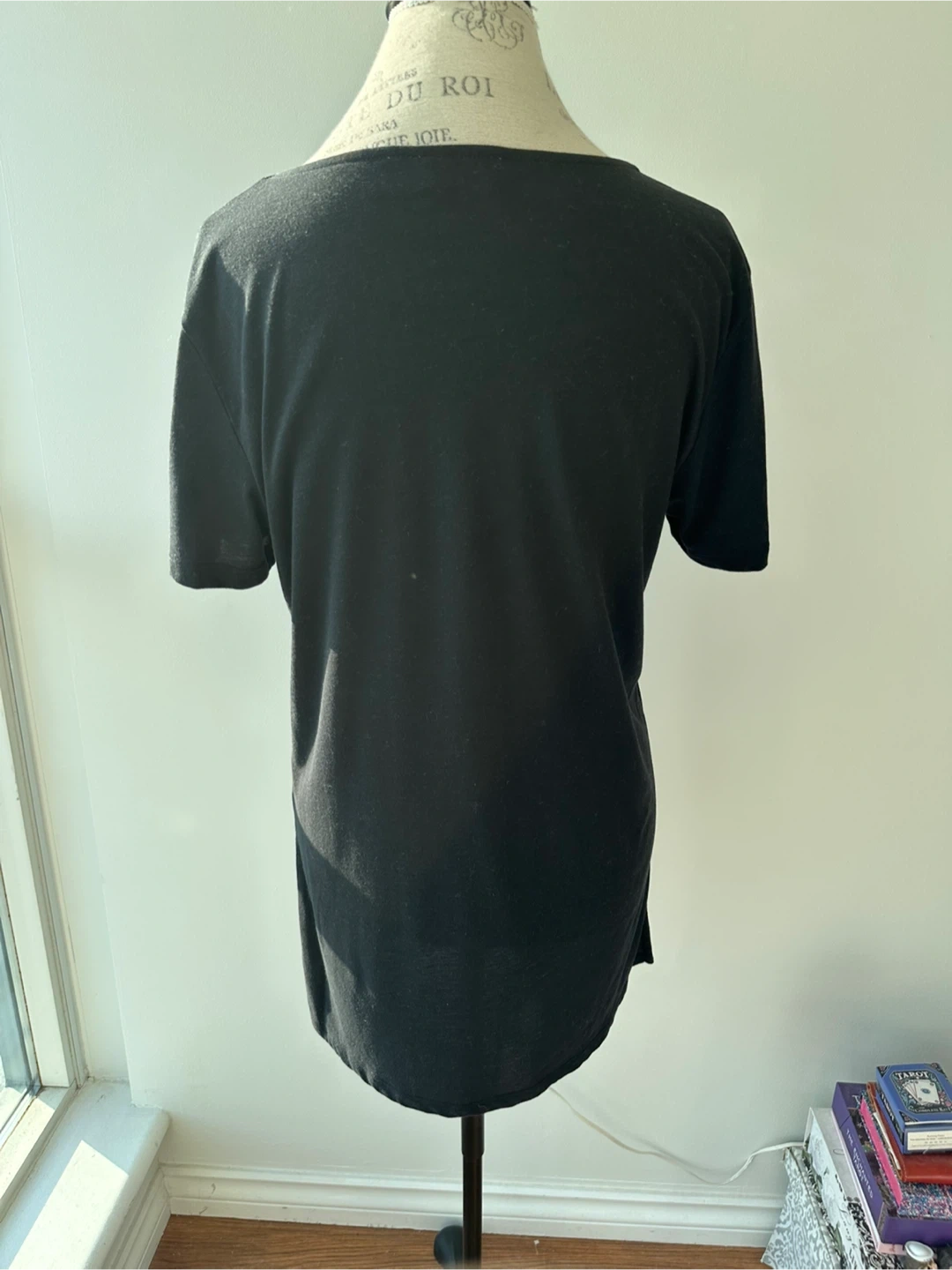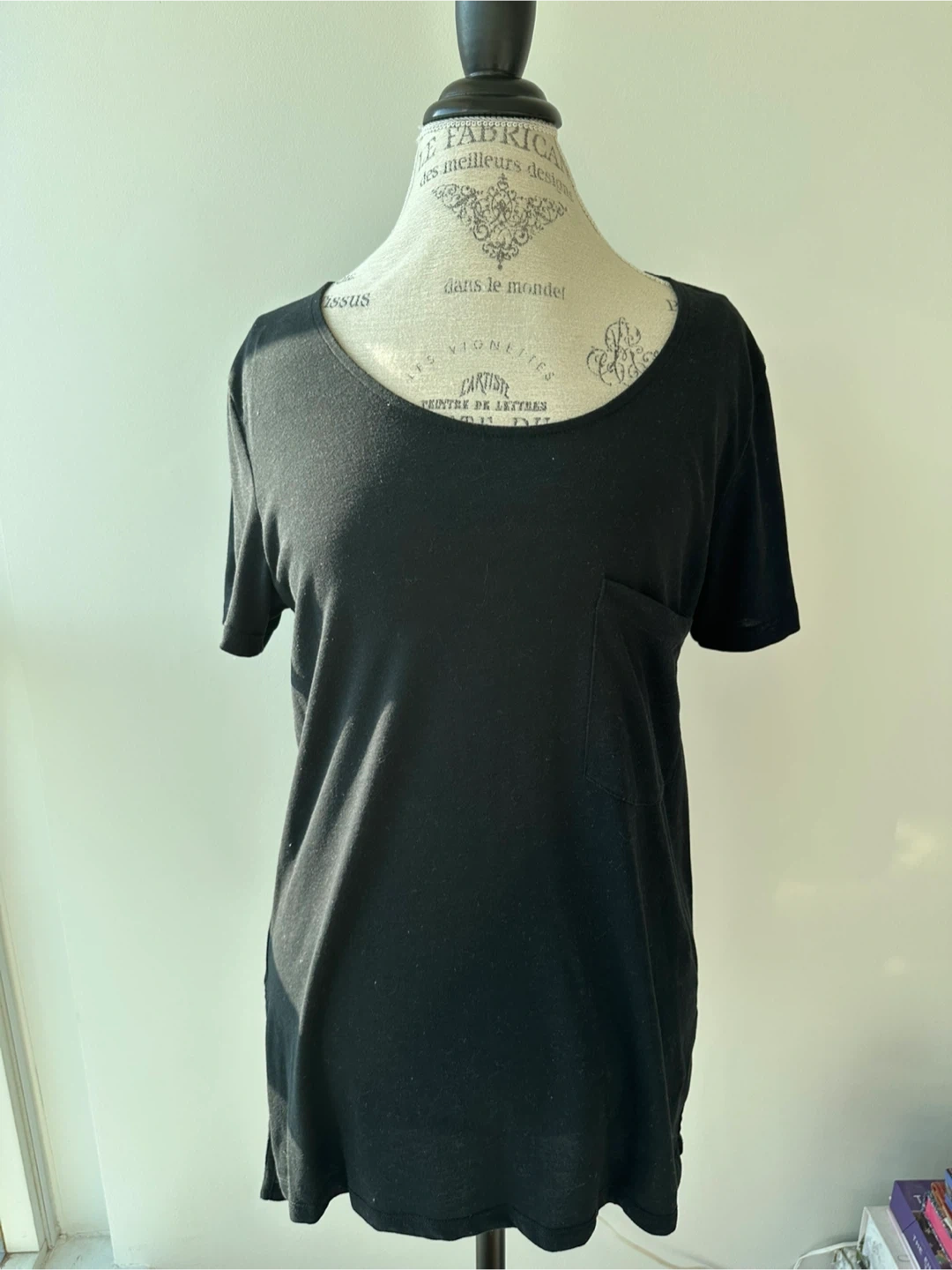 A simple and classic black t-shirt, perfect for everyday wear! It features a small pocket on the chest and slits on the side. The shirt is in great condition and ready for a new home