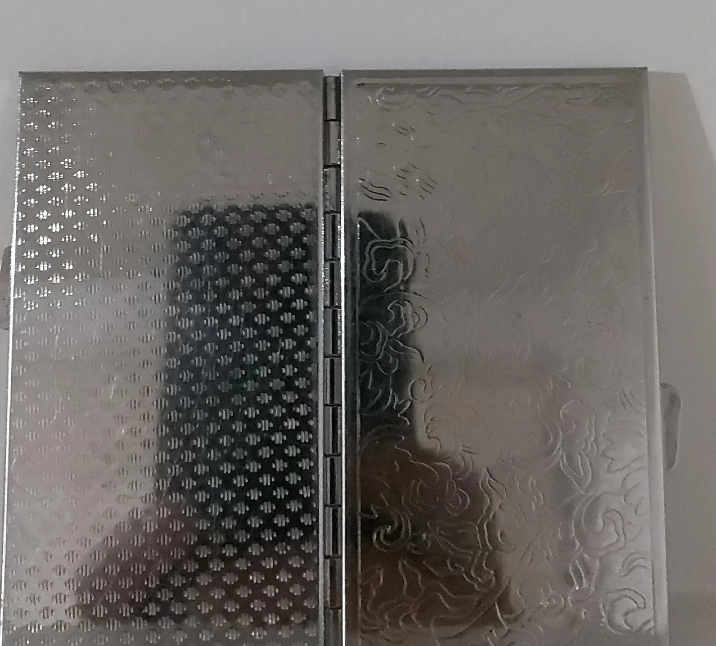 Selling a metal business card holder. It has a floral pattern on one side and a geometric pattern on the other. Great for keeping your cards organized and looking professional