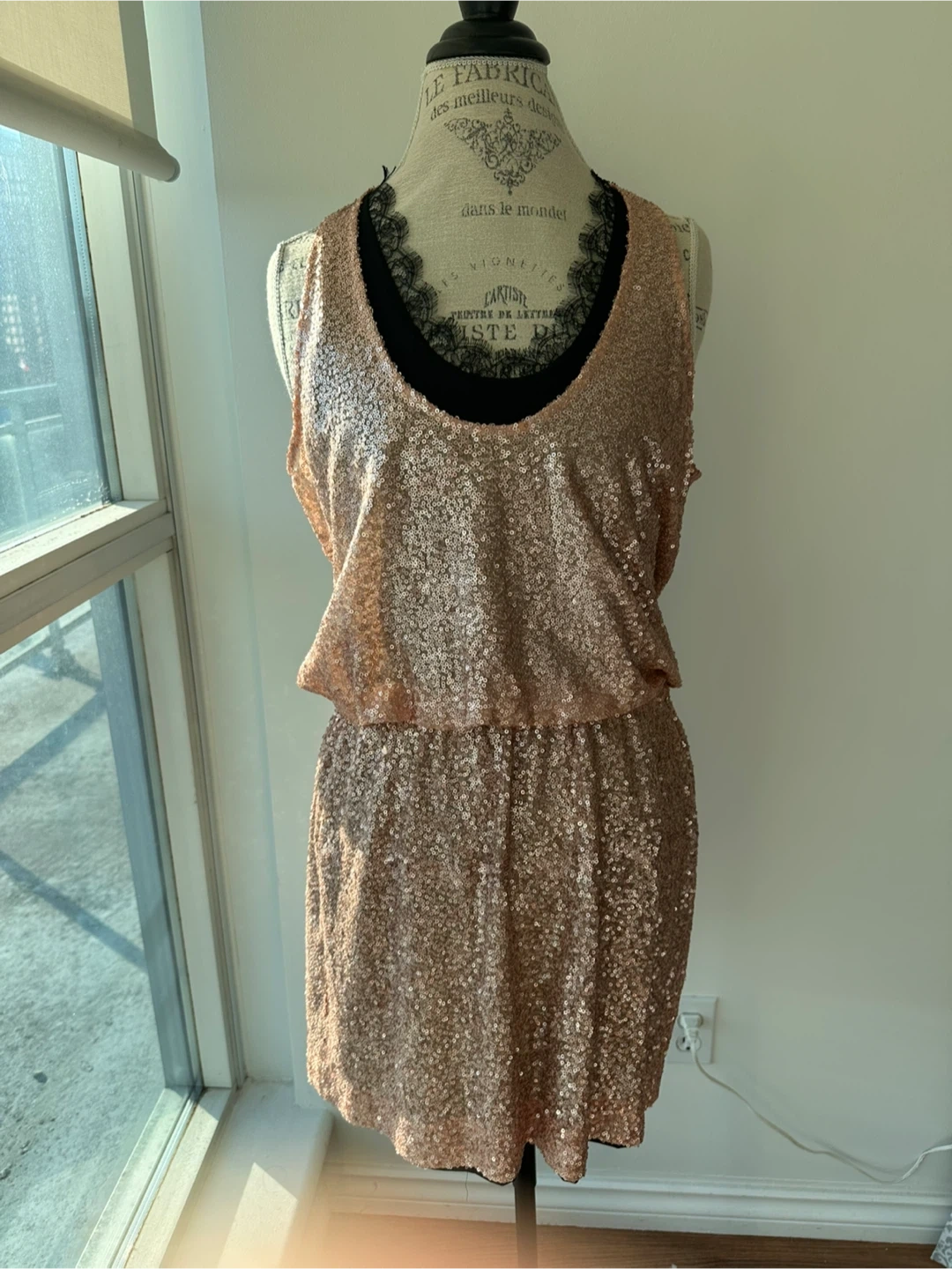 This is a beautiful sequin tank dress! It's a rose gold colour and would be perfect for a night out or a special occasion. The cinched waist is very flattering and the sequins are very sturdy. It's in great condition and perfect for any body shape!