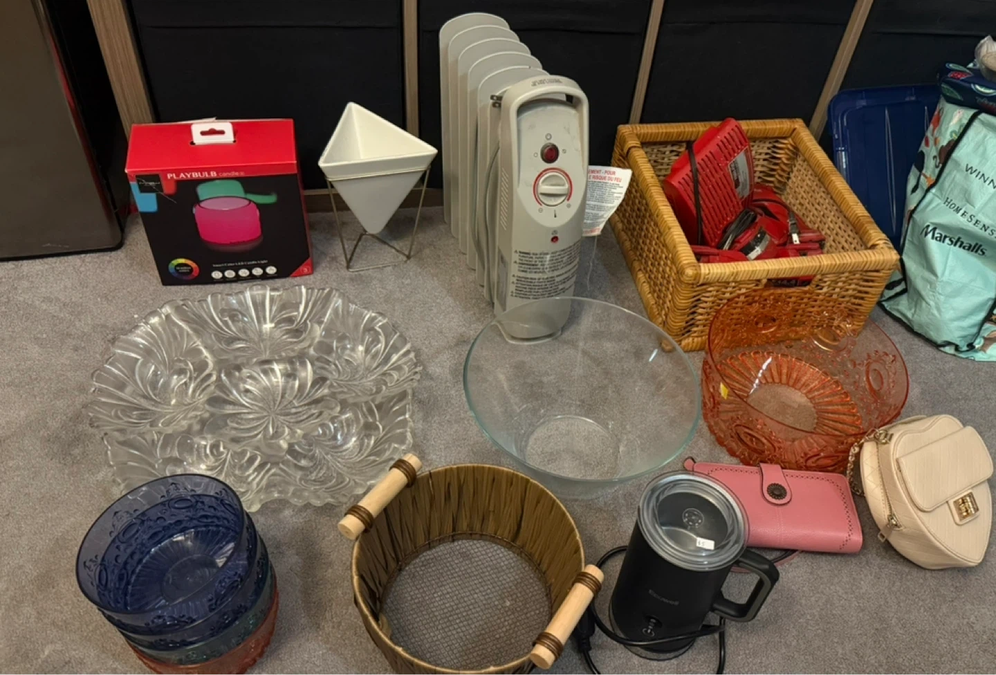 A collection of various home goods including a Playbulb Candle, space heater, baskets, bowls, and more! Perfect for someone looking to add some variety to their home decor or kitchenware