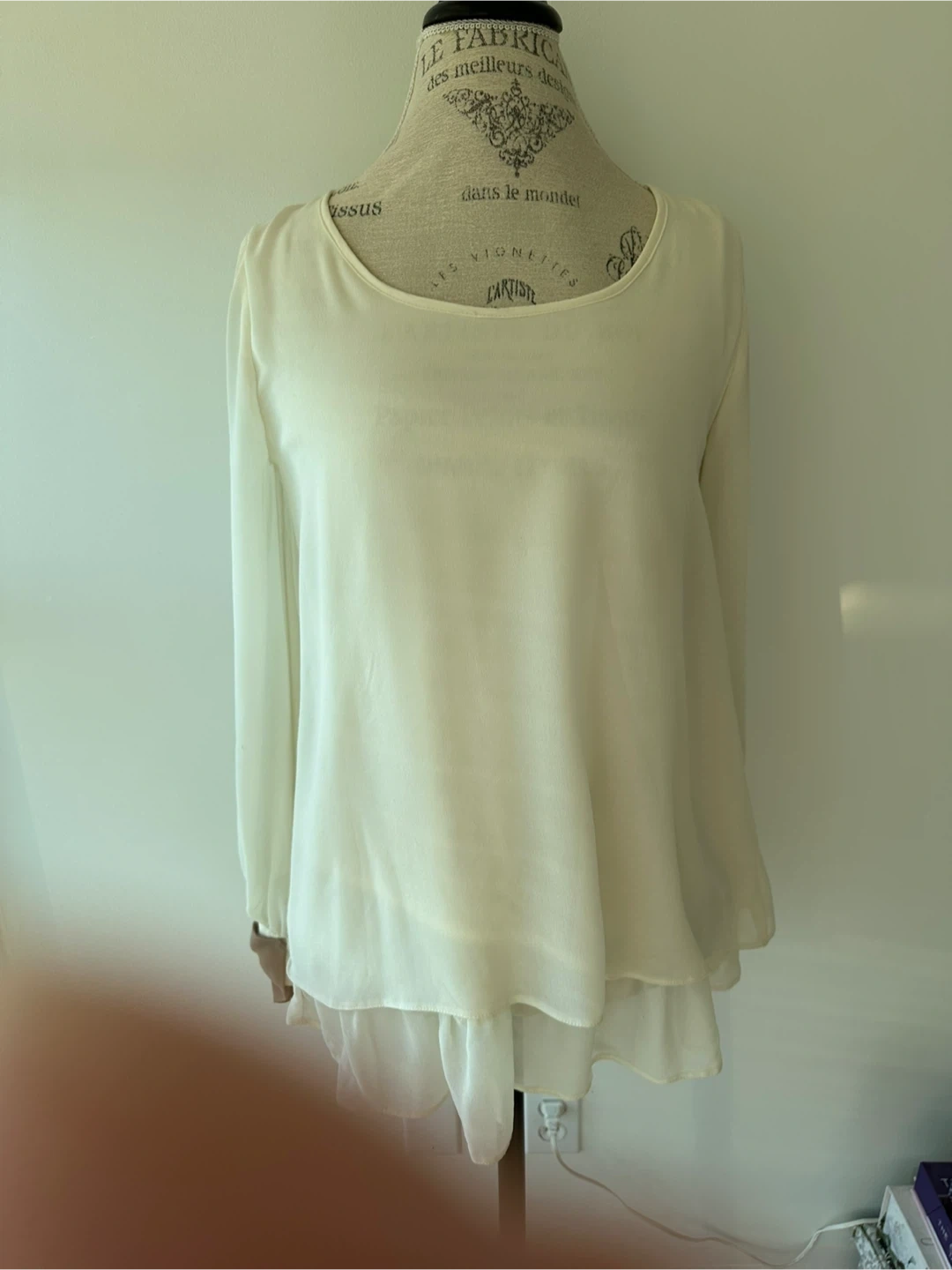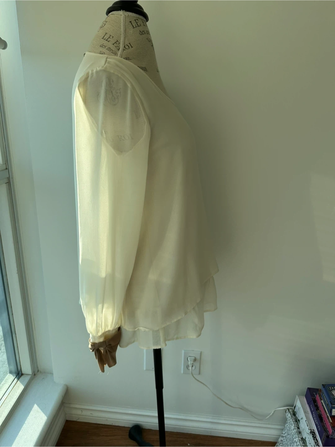 This cream-coloured blouse features long sleeves and a charming bow detail on the cuffs. It's in great condition and ready to add a touch of elegance to your wardrobe!