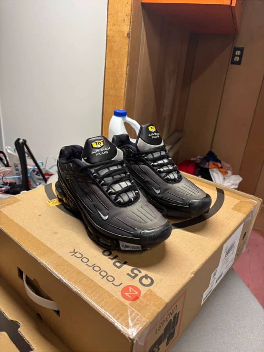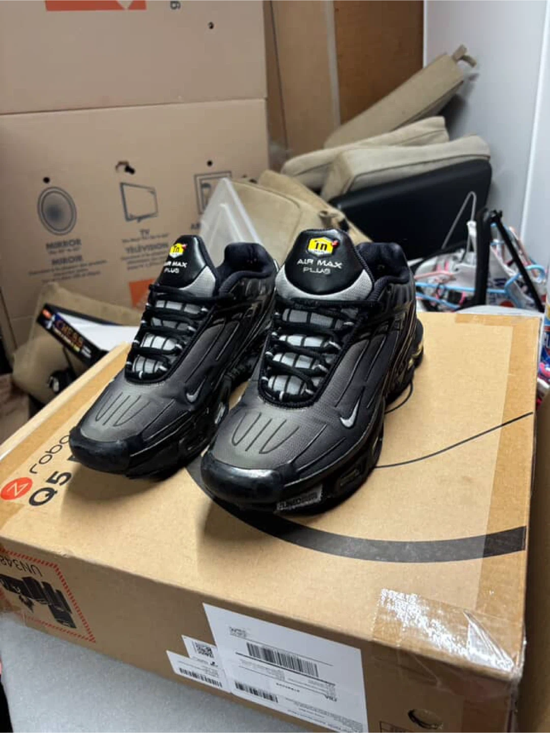 Selling a pair of Nike Air Max Plus TN3 shoes in black. They are in good condition and ready for a new home. The box is included!