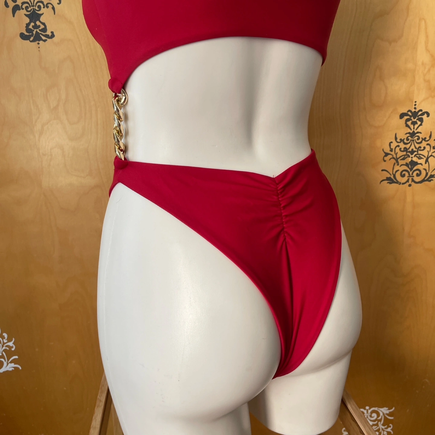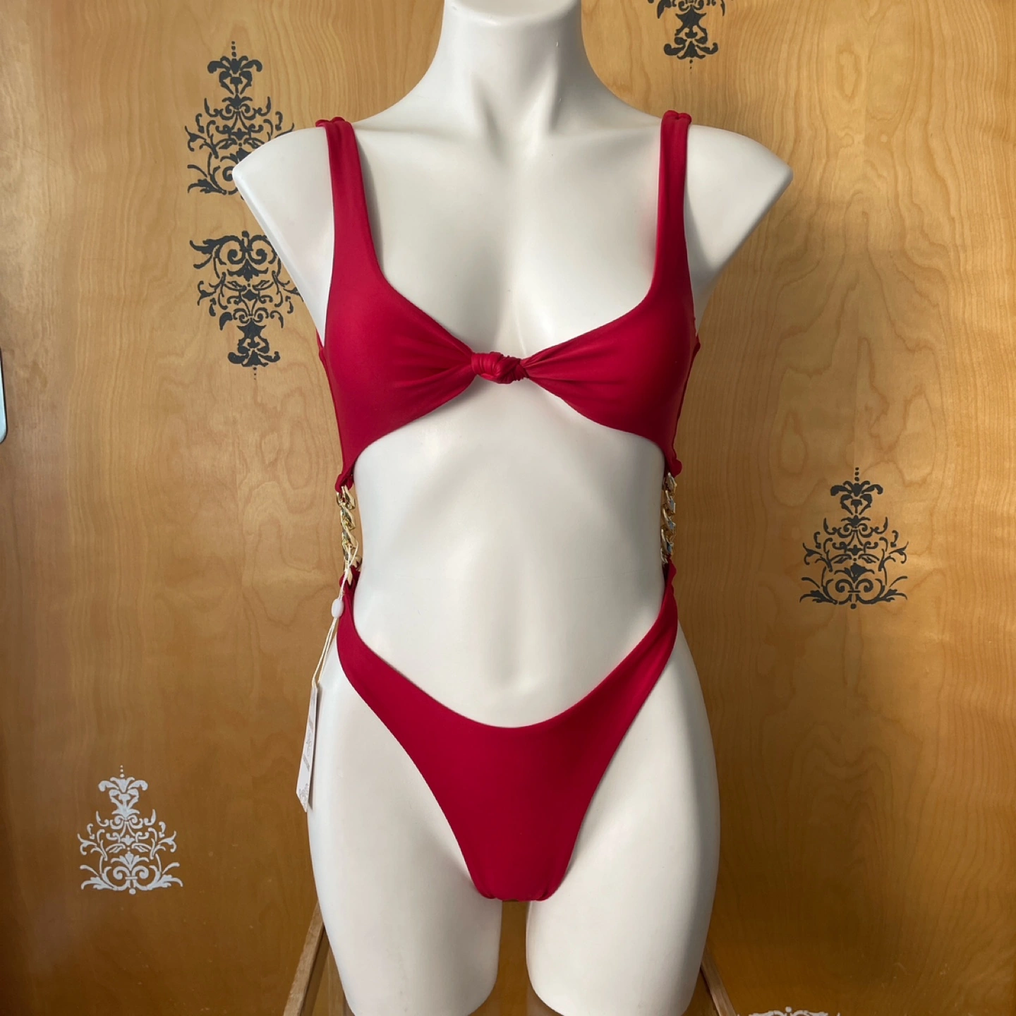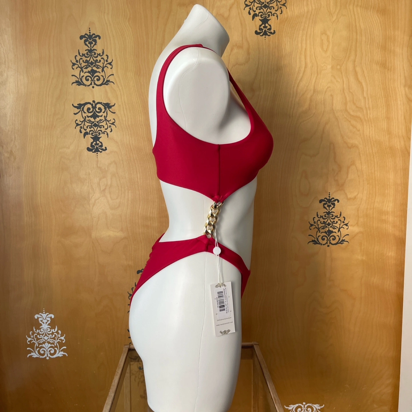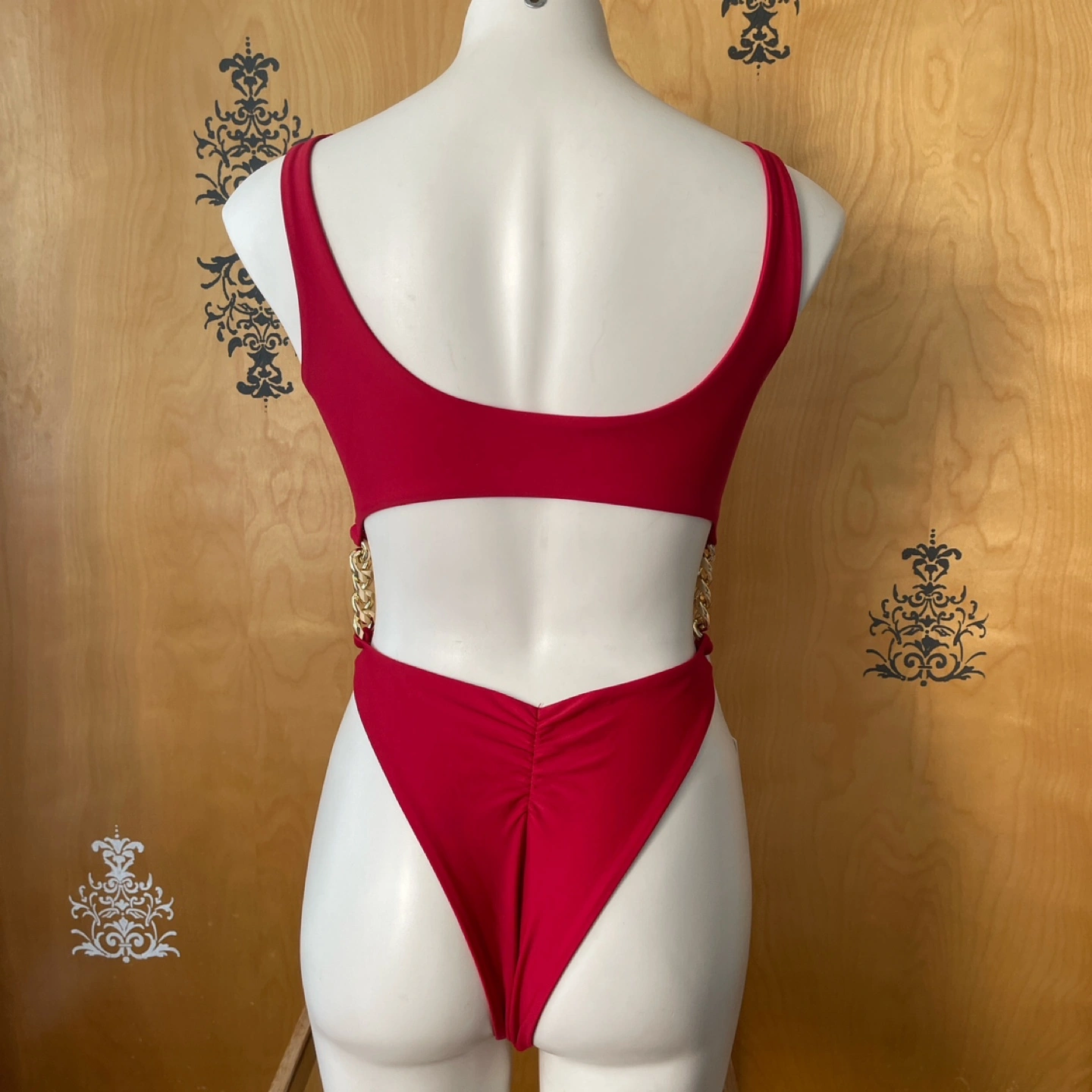 NWT Red Monokini ‘Baywatch’ Swimsuit Cut Out Gold Chain Details Low Cut & High Cut Cheeky Bottoms Small