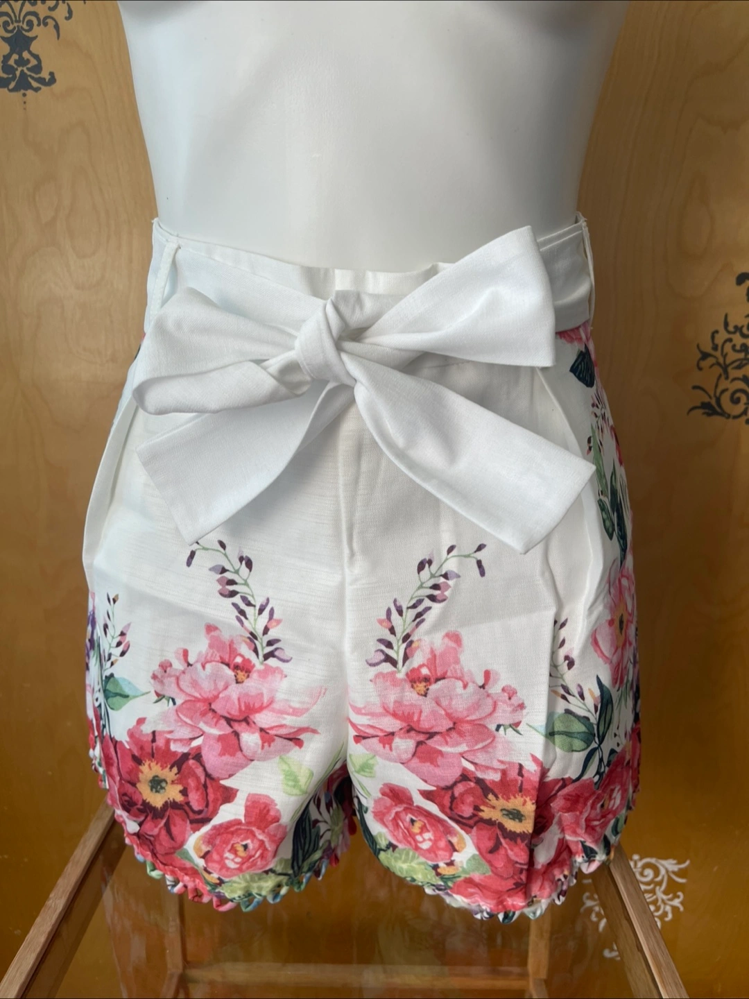 Vintage 2000s Y2K White Colourful Print Floral High Waisted Shorts Side Pockets Removable Belt S/M