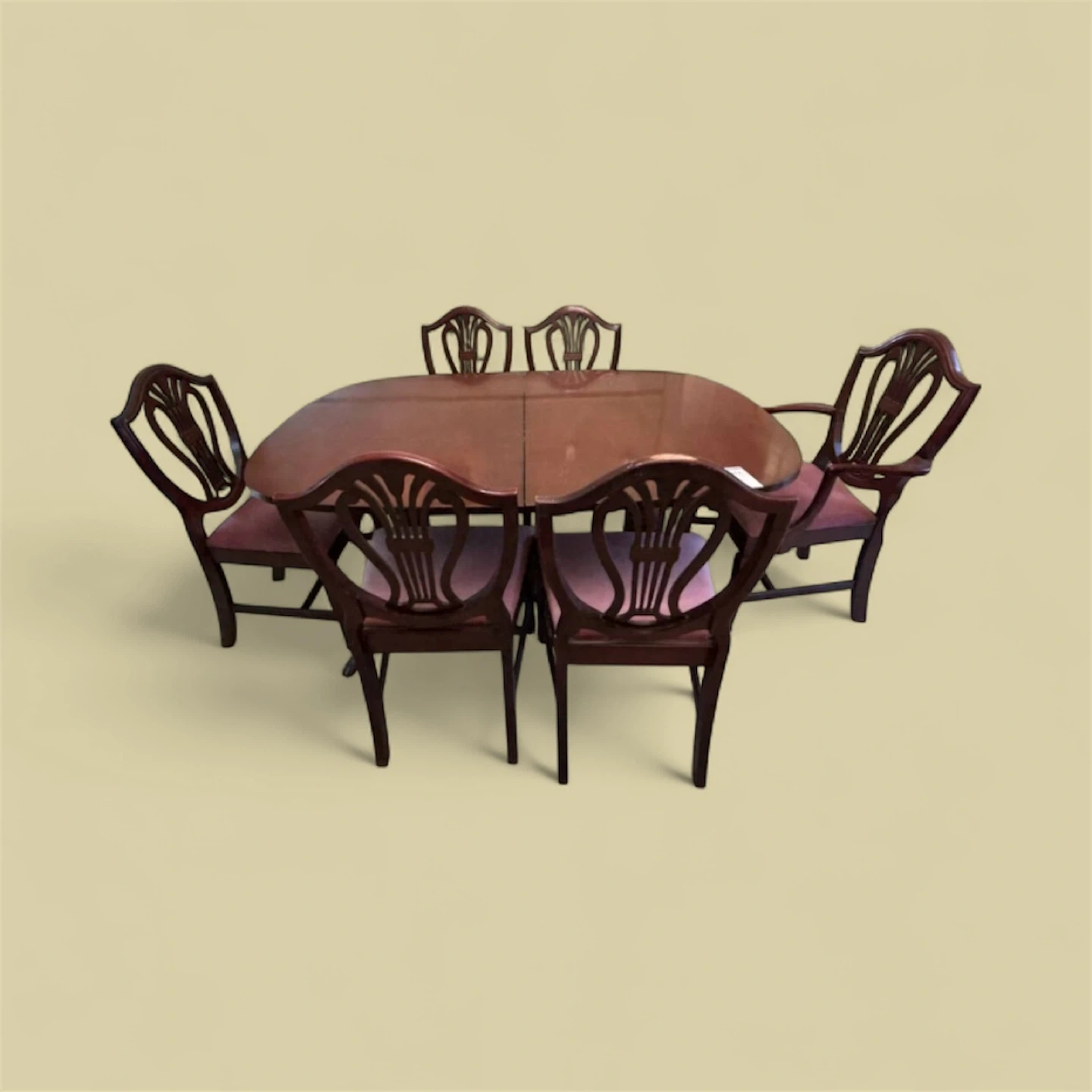 Selling a dining table with chairs. It's a lovely set for any dining room! The set includes a table and six chairs. The chairs have a classic design with a dark wood finish and upholstered seats.