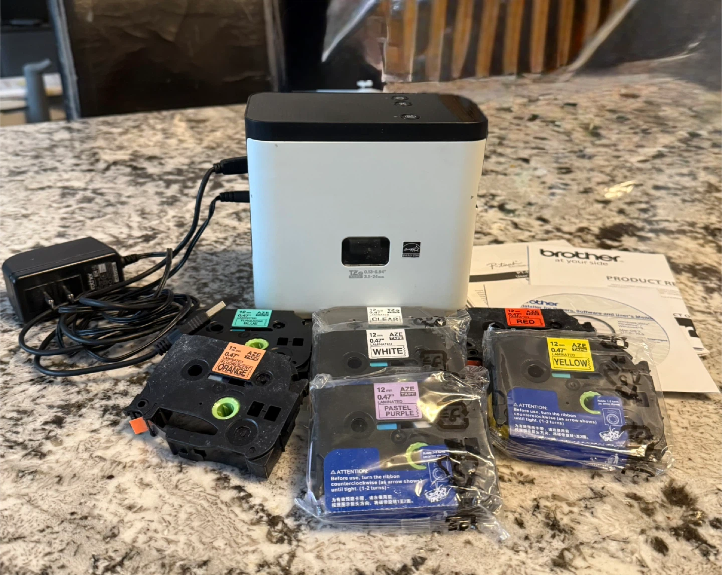 Selling my Brother PT-P700 label maker, used it mostly for home organizing. Comes with 7 tapes (3 sealed!), CD, adapter, and USB cable. Super handy for labeling bins, folders, pantry jars, school stuff, etc.