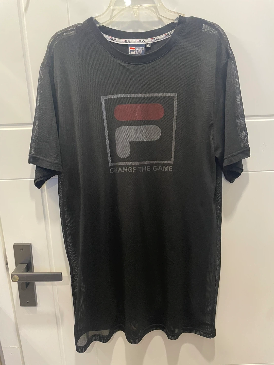 71Selling a black mesh t-shirt from Fila. The shirt has the Fila logo on the front with the words 'Change the Game' written underneath. It's a great shirt for layering or wearing on its own