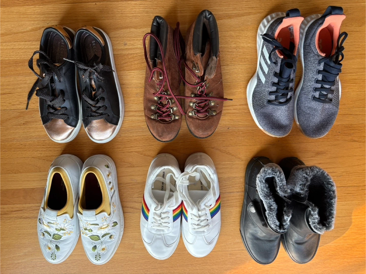 A collection of shoes including Skechers, Mark Nason, Adidas and hiking boots. Sizes is 7-7.5 , they are in good condition,each one is 10-30 $. Massage me for more details