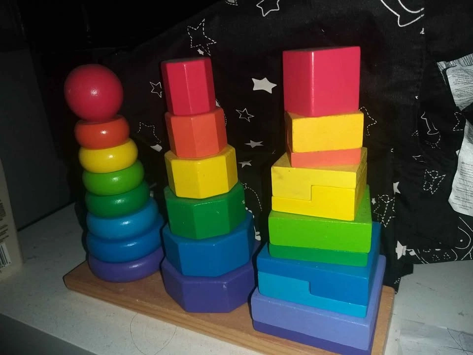 From smoke free & pet free home. - 25 colorful wooden pieces to match and stack on three rods. - Rings, octagons, and rectangles. Great for early skill learning (stacking, matching, sorting, building, shape, size differentiation, color, geometry). For toddlers and preschoolers, ages 2 to 5, for hands-on, screen-free play. Retails for $48.58 after tax. Pickup from Carabob Court, Scarborough. Main intersection: Birchmount & Sheppard.