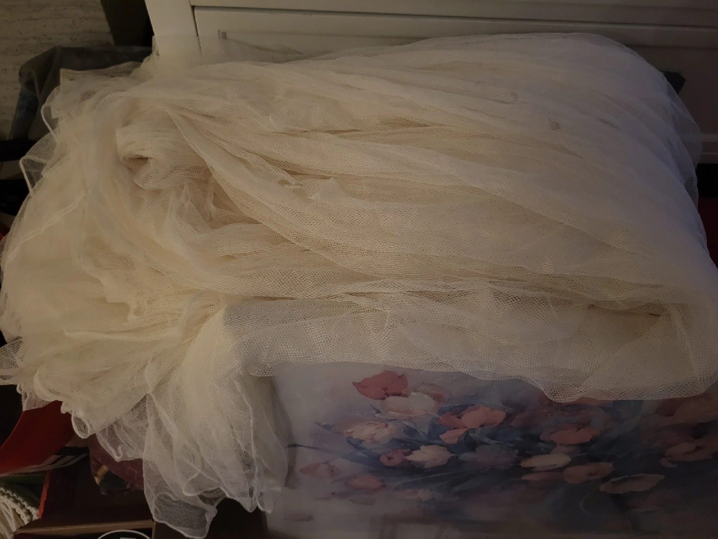 Selling a large piece of fabric mesh to protect babies or adults against mosquitos and flies. It's a soft, lightweight material that can be used for a variety of projects. It has a whole that can be covered with a piece of figurine clothes.