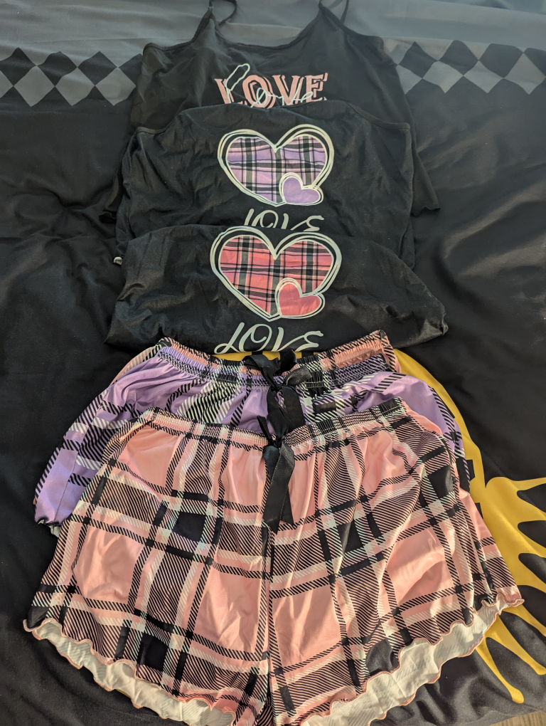 Selling some cute pajama sets! The set includes three tops with a 'Love' design and three pairs of shorts with a plaid pattern. Both are too short for me.