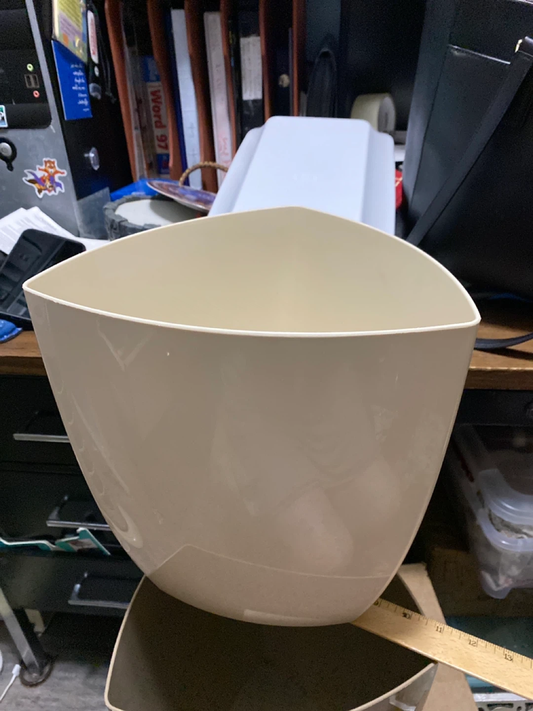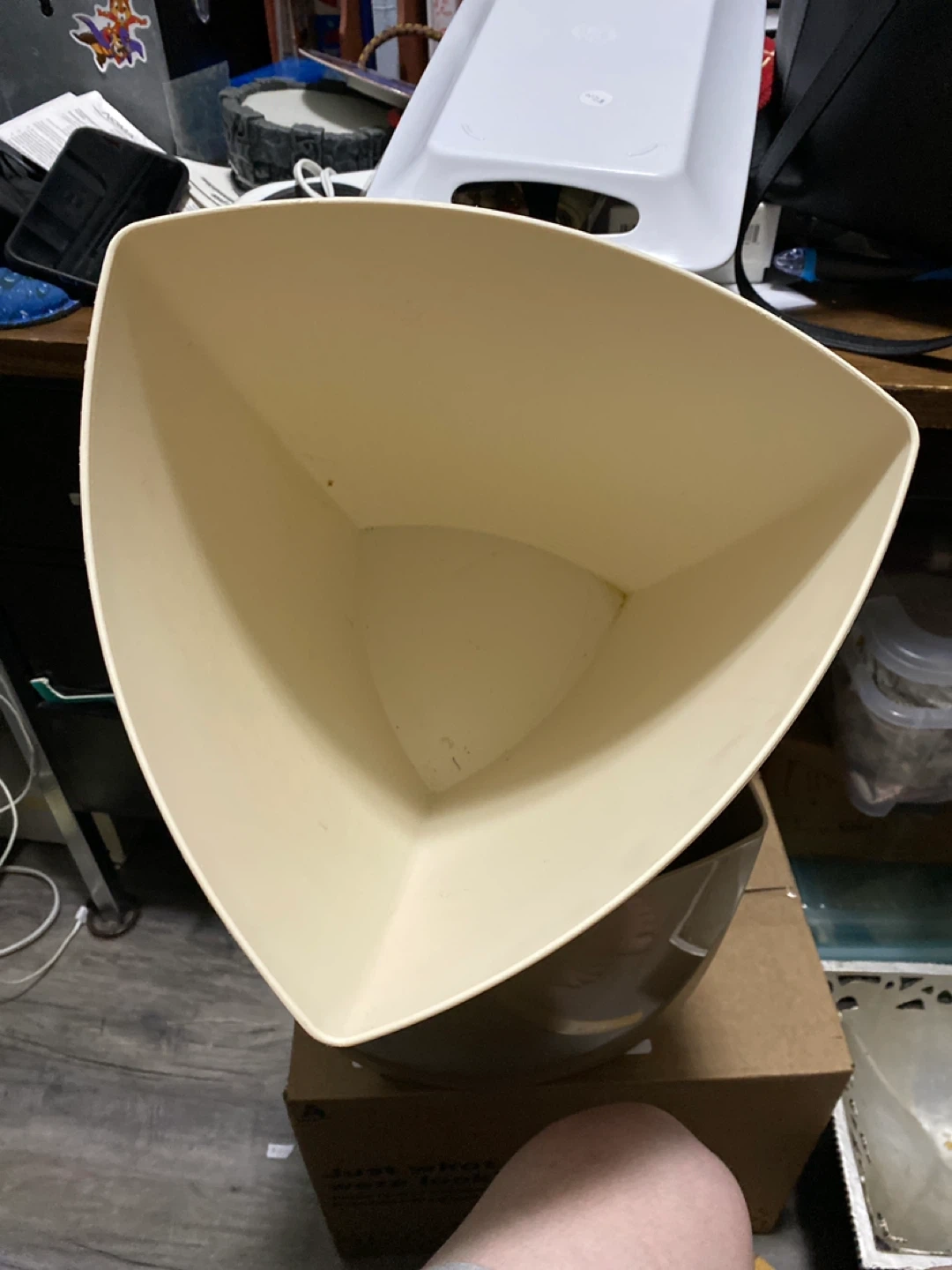 116Selling a beige triangular waste bin. It measures approximately 11-12 inches in height. It's in good condition and ready to use! $3 each Great for office and bedrooms