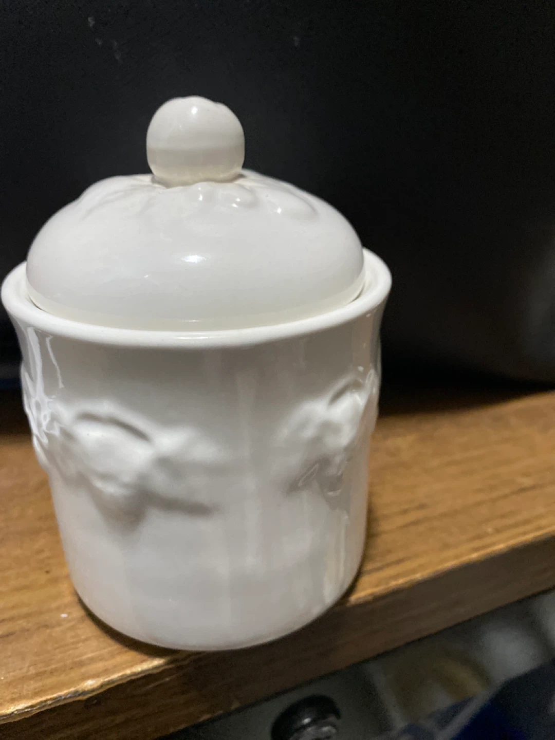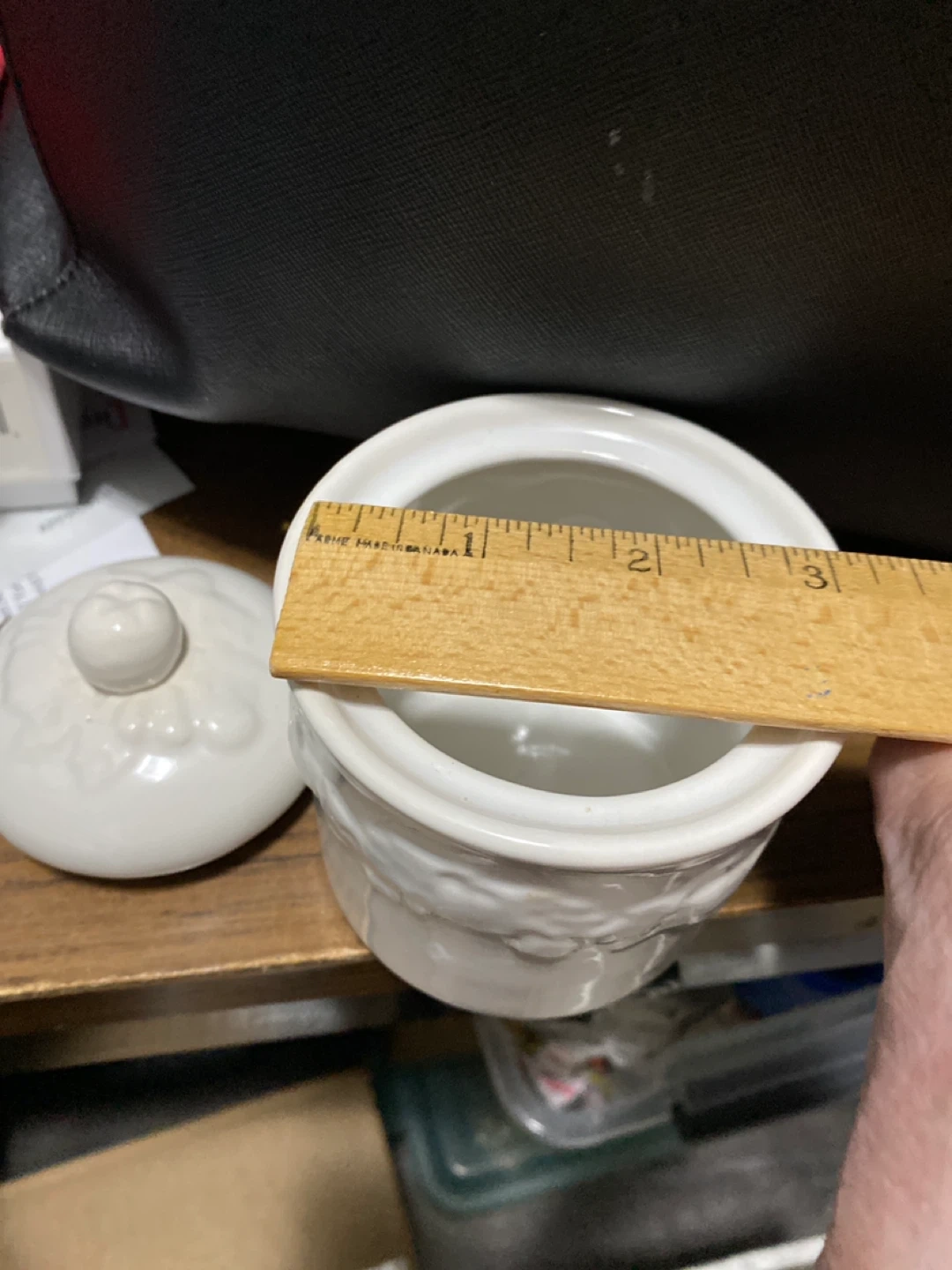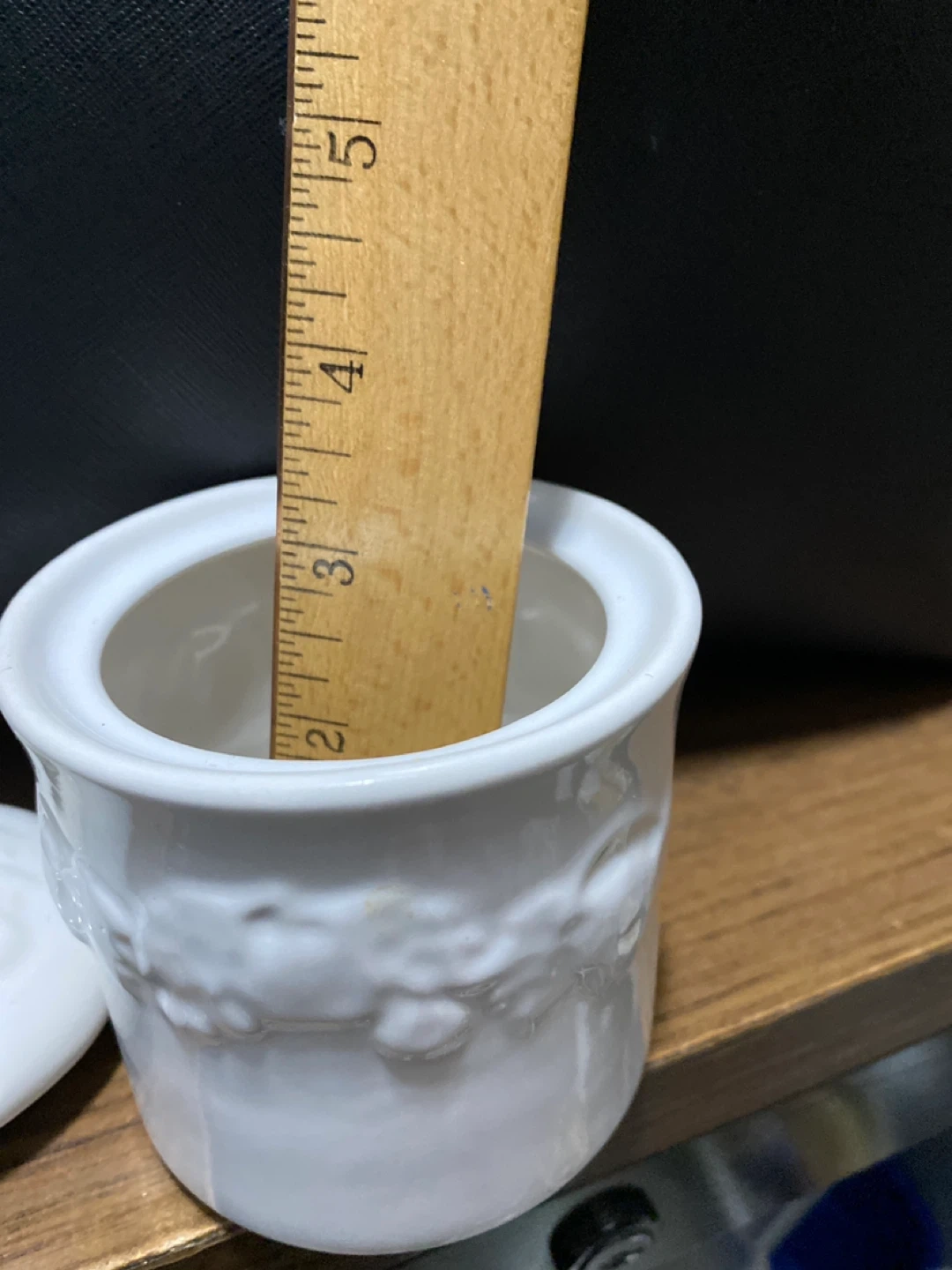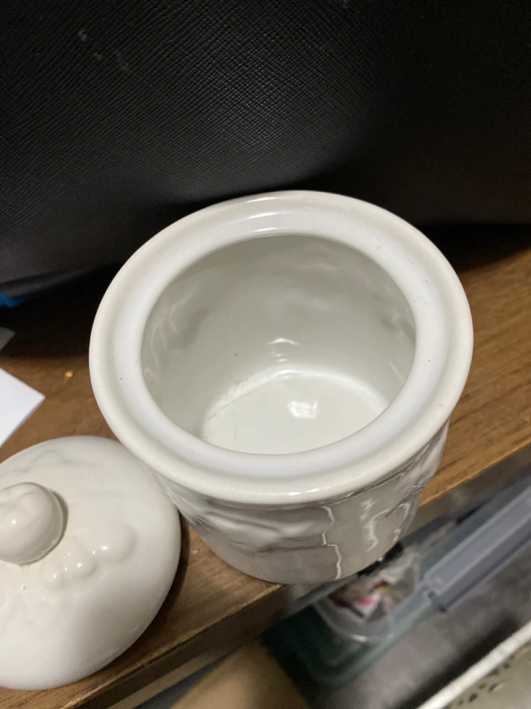 Selling a small white ceramic jar with a lid. It's about 3 inches wide and 4 inches tall. Perfect for storing small items or using as a decorative piece
