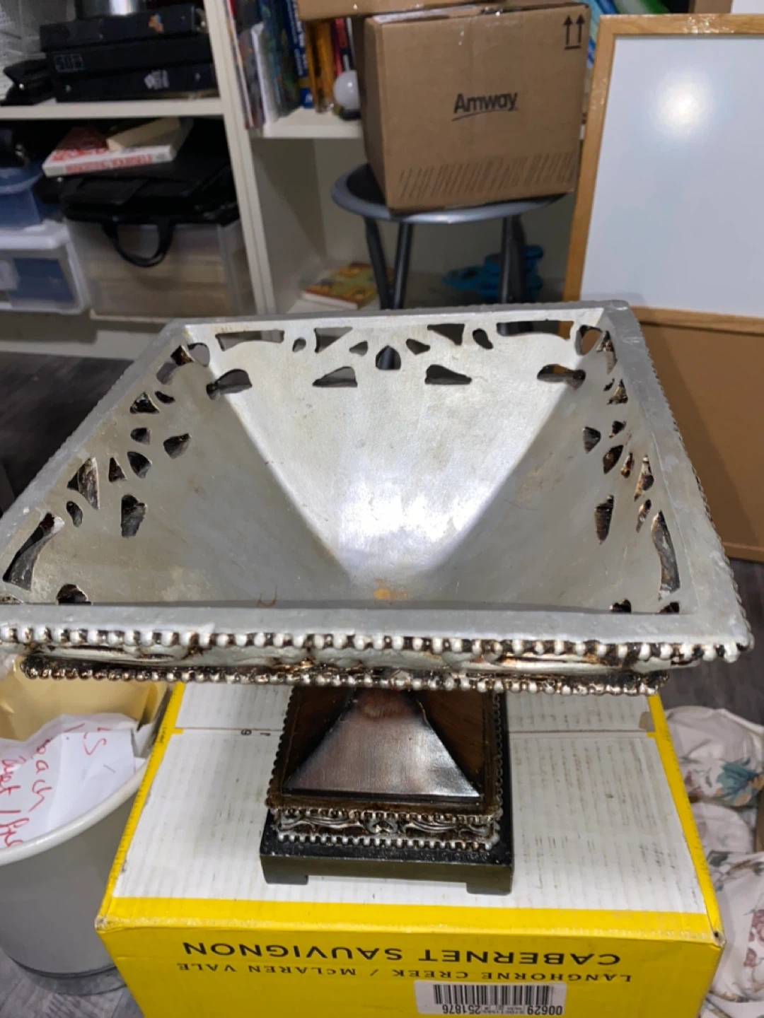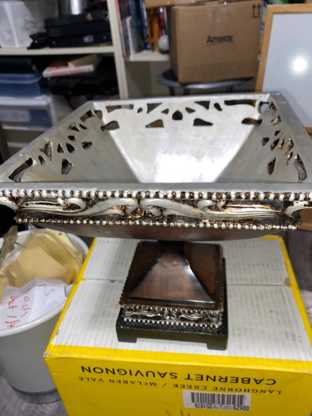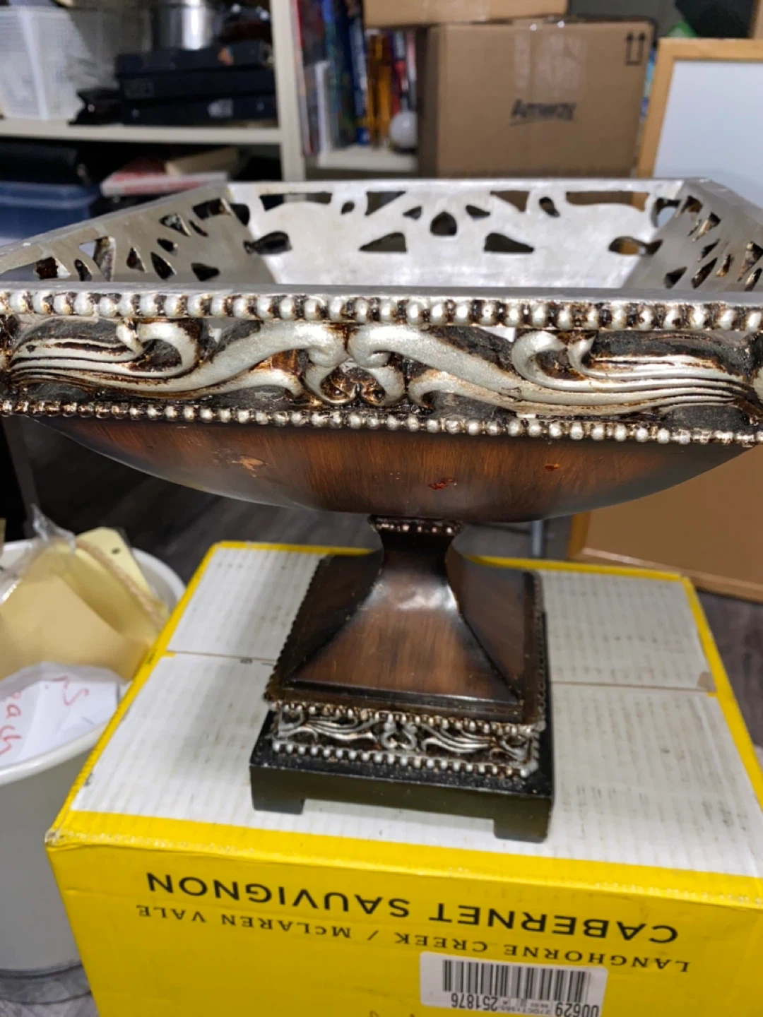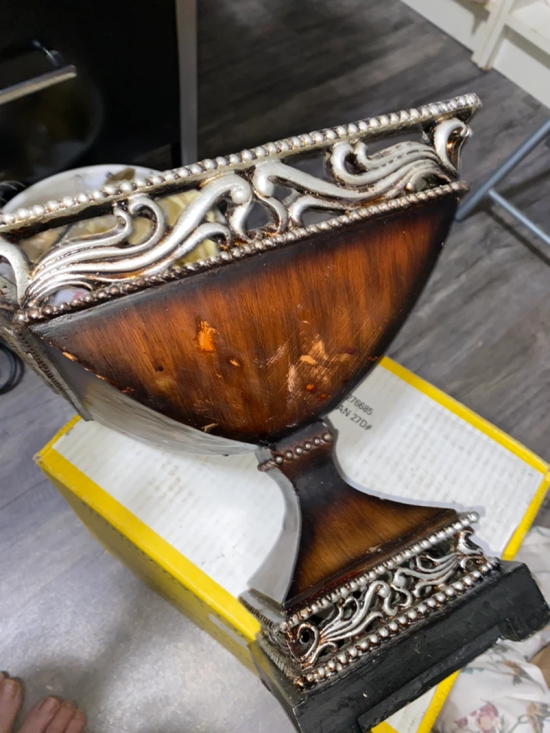 This is a decorative bowl with a unique design. It features ornate details in silver and brown tones. The bowl is supported by a pedestal base, adding to its elegant appearance. It comes with its original box!