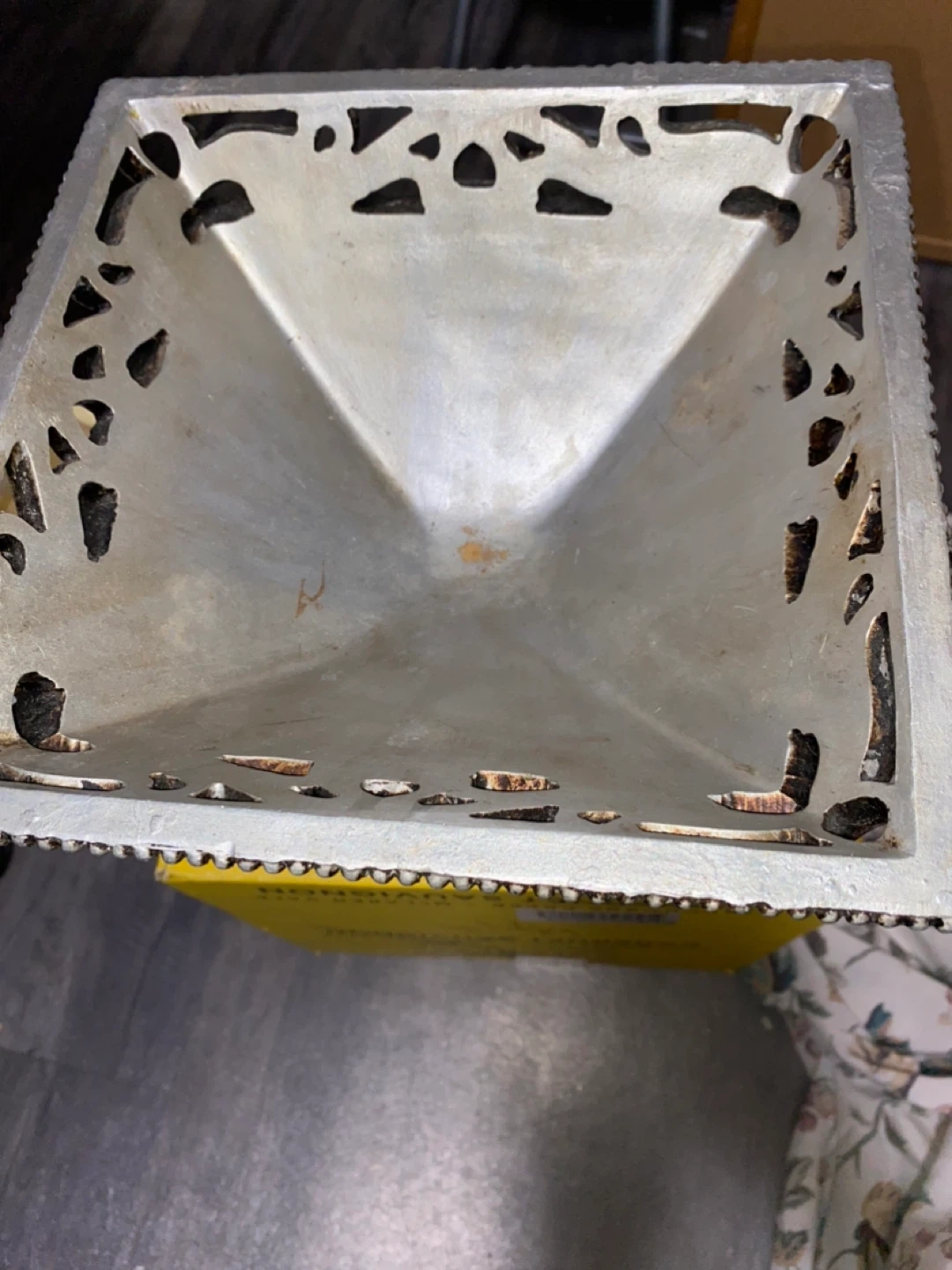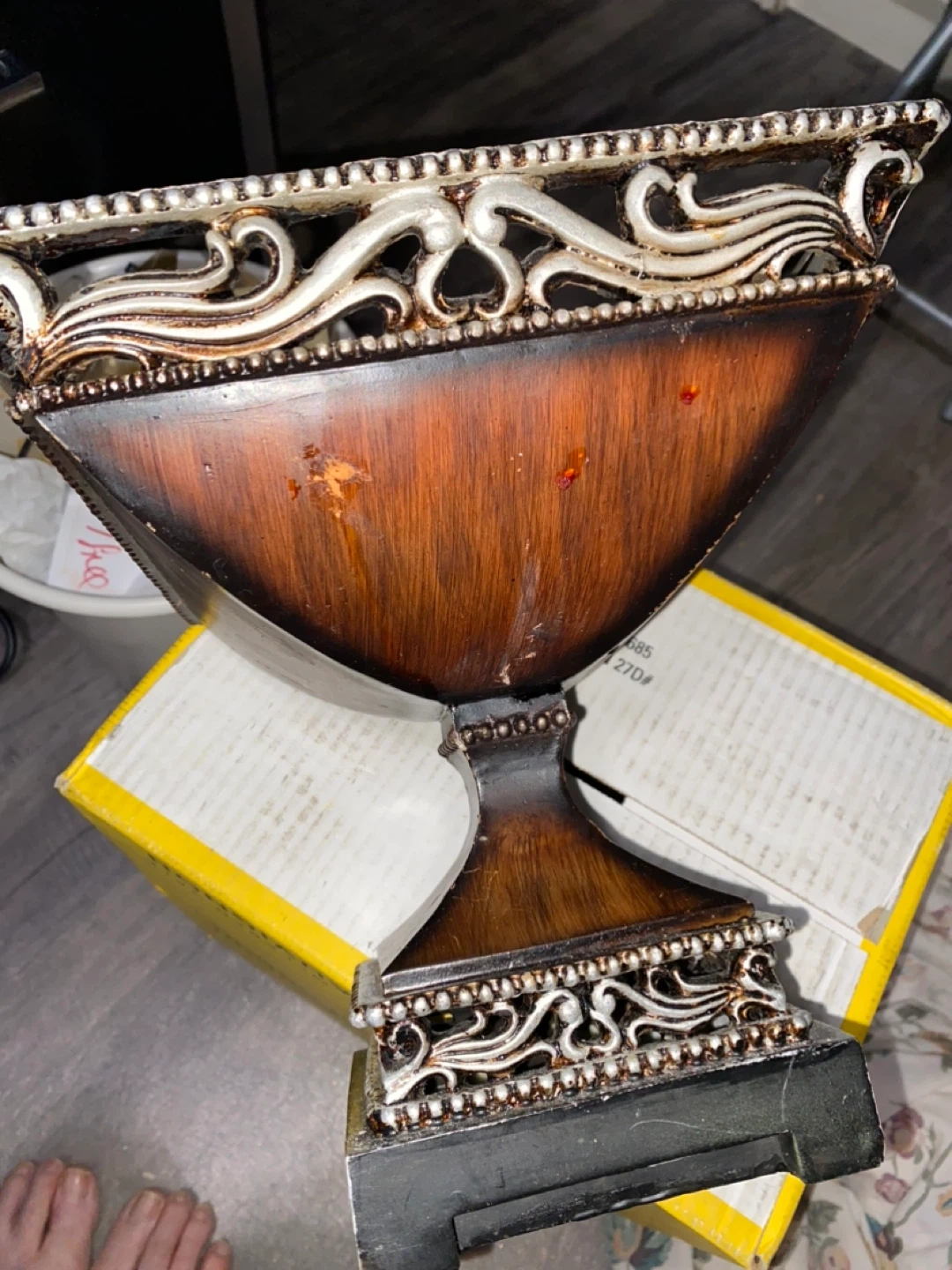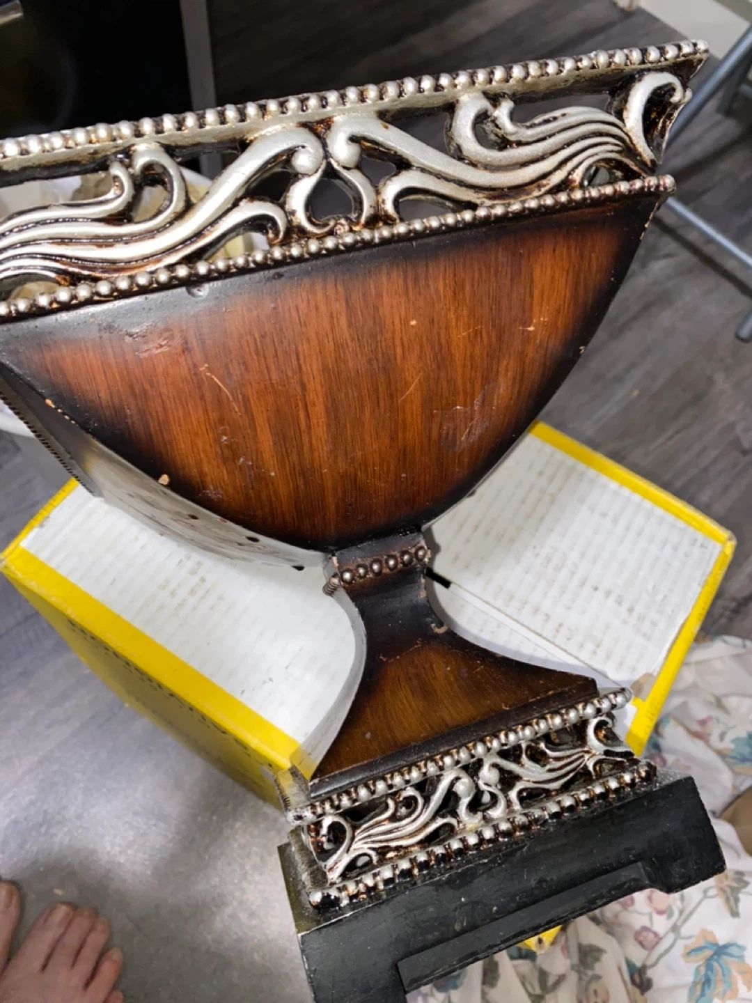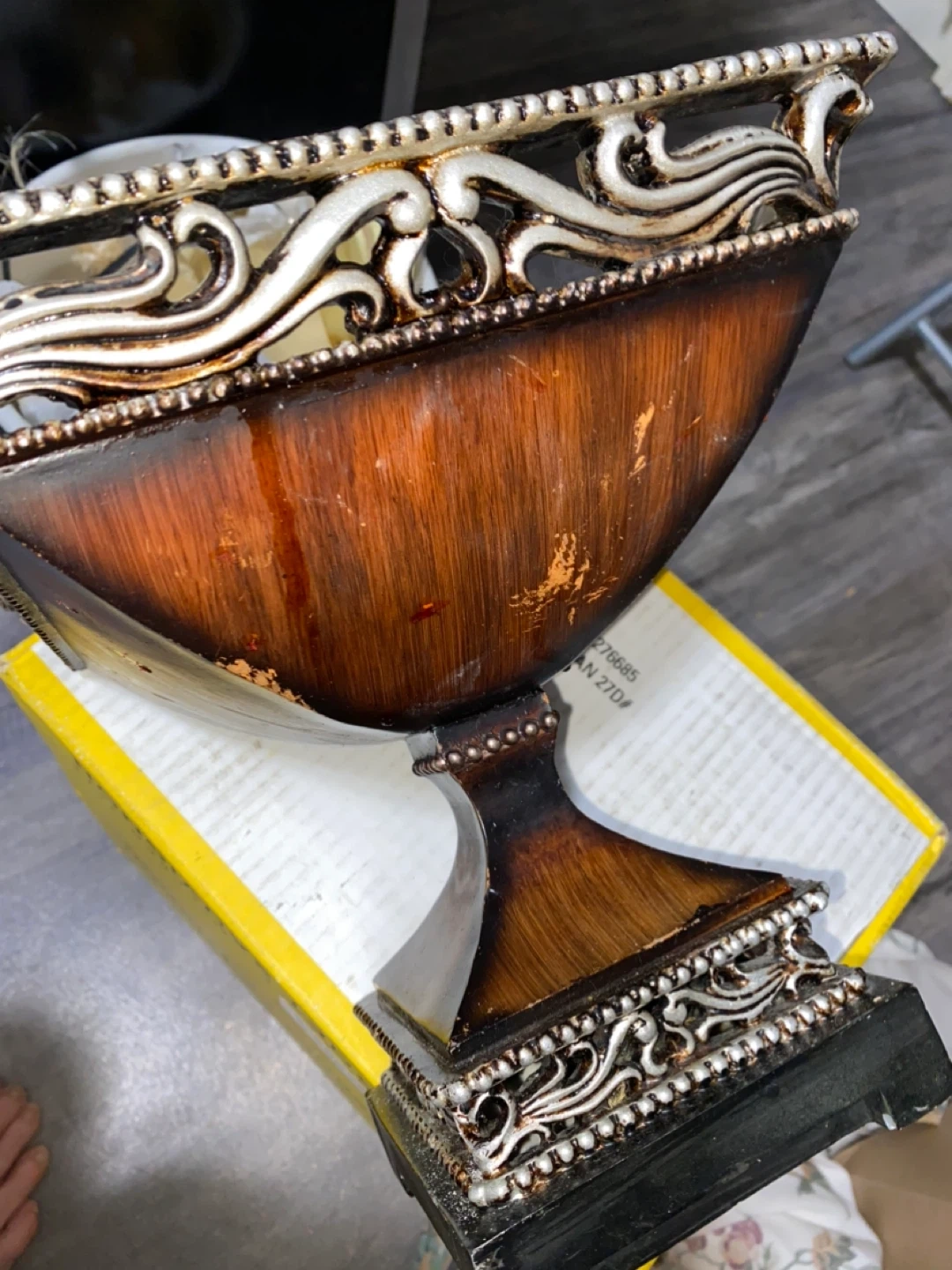 This is a decorative bowl with a unique design. It features ornate details in silver and brown tones. The bowl is supported by a pedestal base, adding to its elegant appearance. It comes with its original box!
