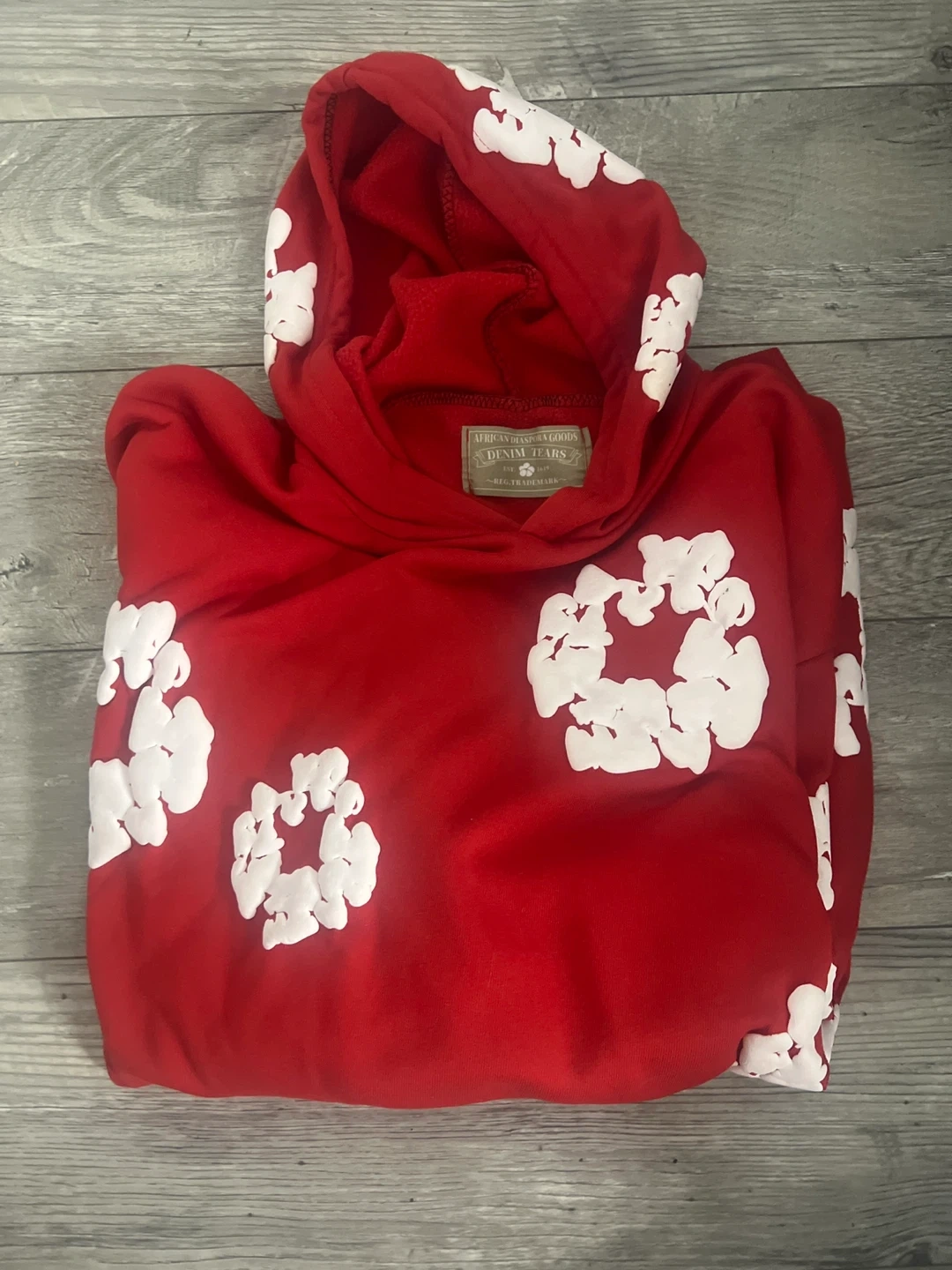 Selling a red Denim Tears hoodie in size medium! It features a unique white floral design. It's in great condition and ready for a new home