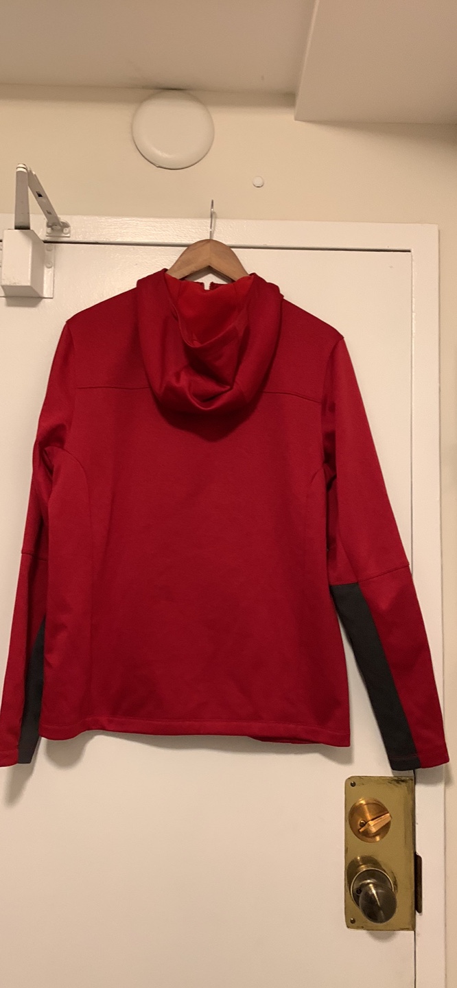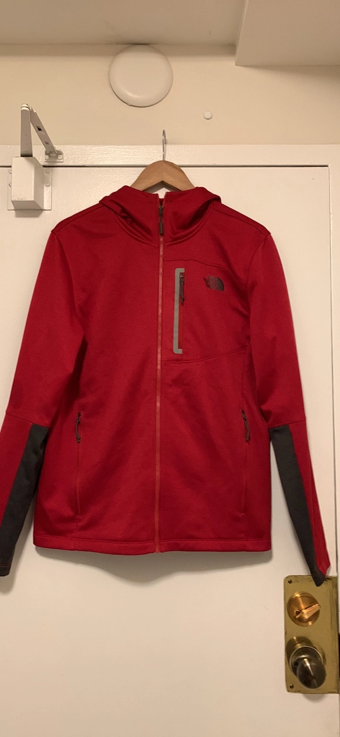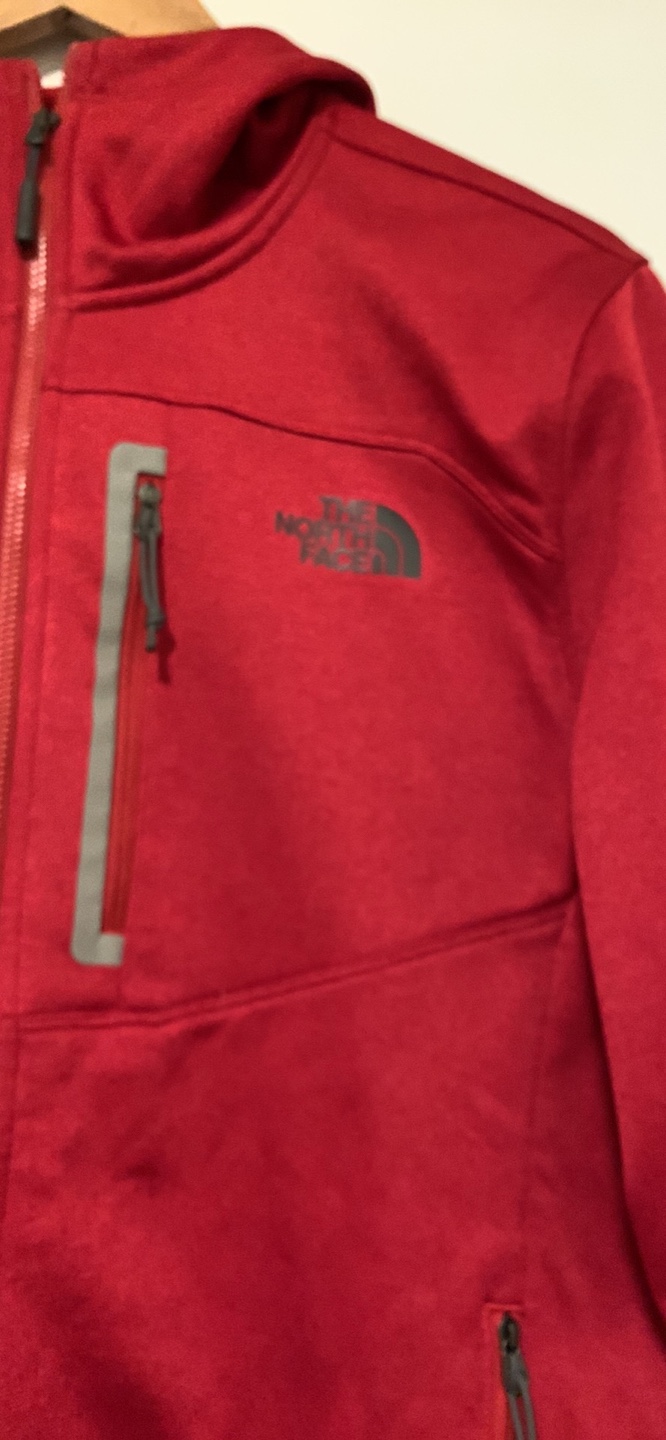 Selling a red The North Face full zip hoodie. It features a full zipper, a hood, and a small zipper pocket on the chest. The sleeves have a dark grey accent colour.
