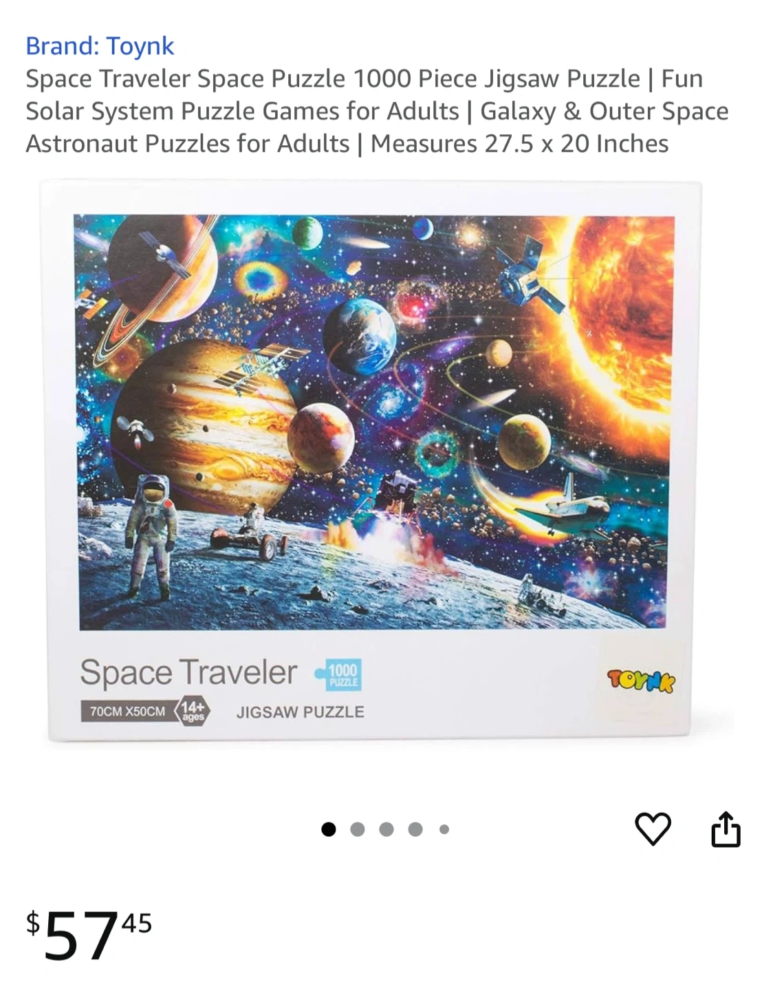 Selling a brand new Toynk Space Traveler 1000 piece jigsaw puzzle! It features a fun solar system space theme with an astronaut design. Measures 27.5 x 20 inches.