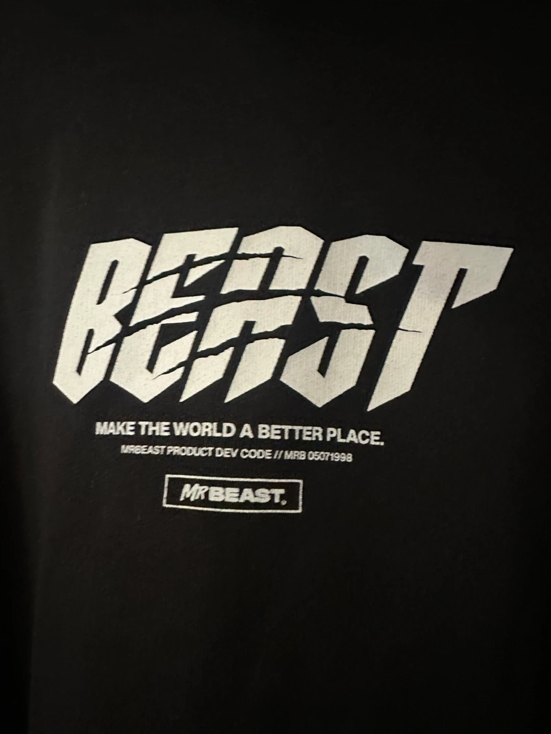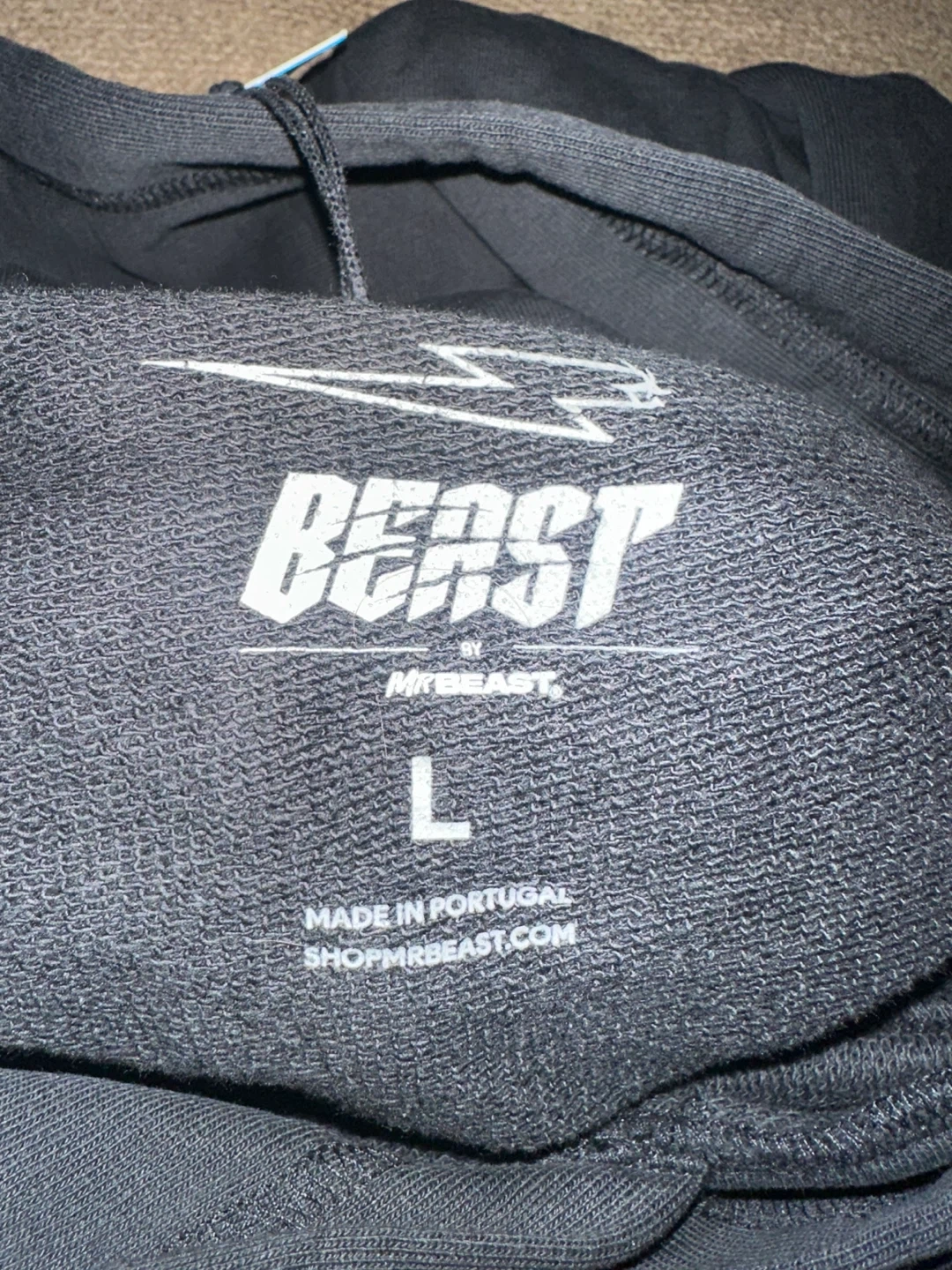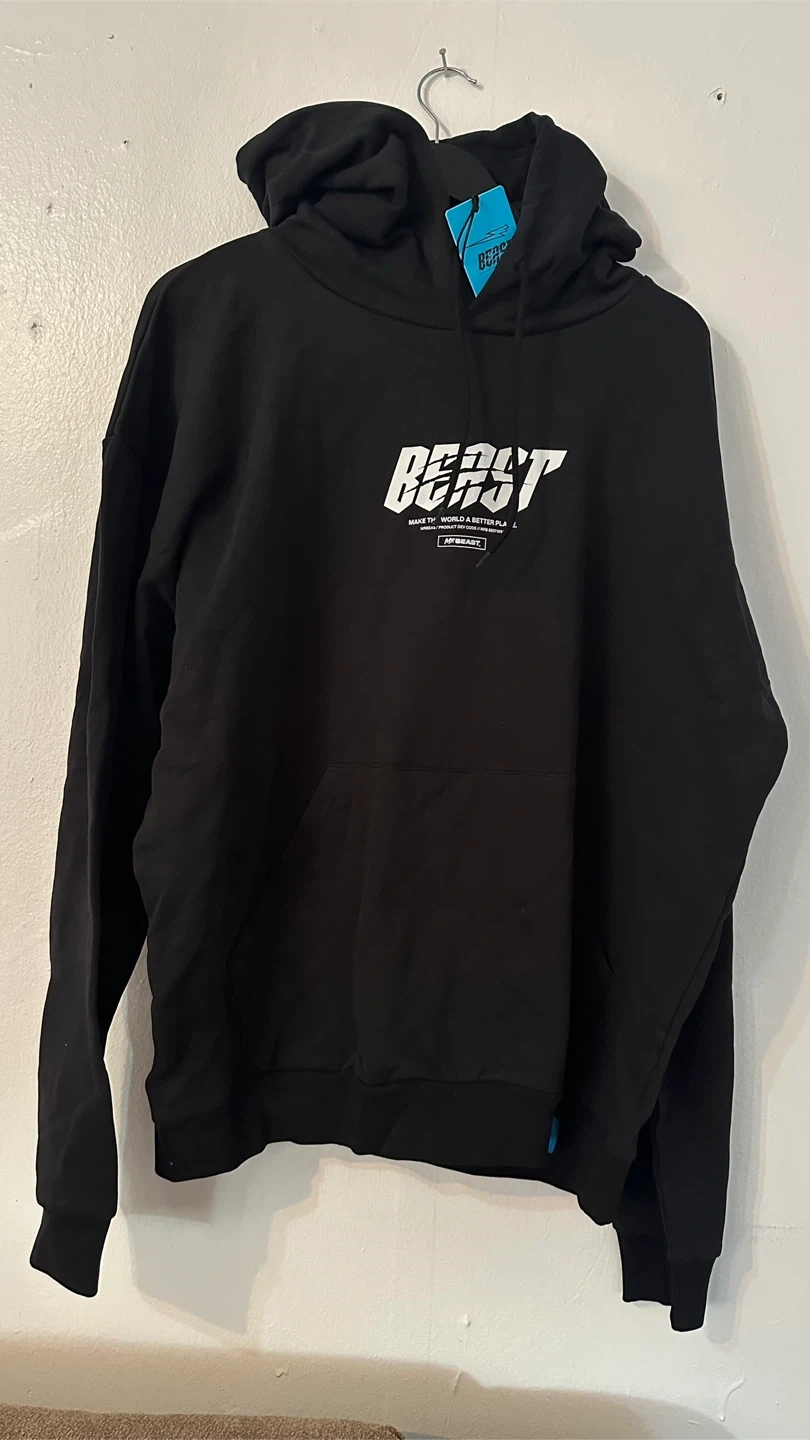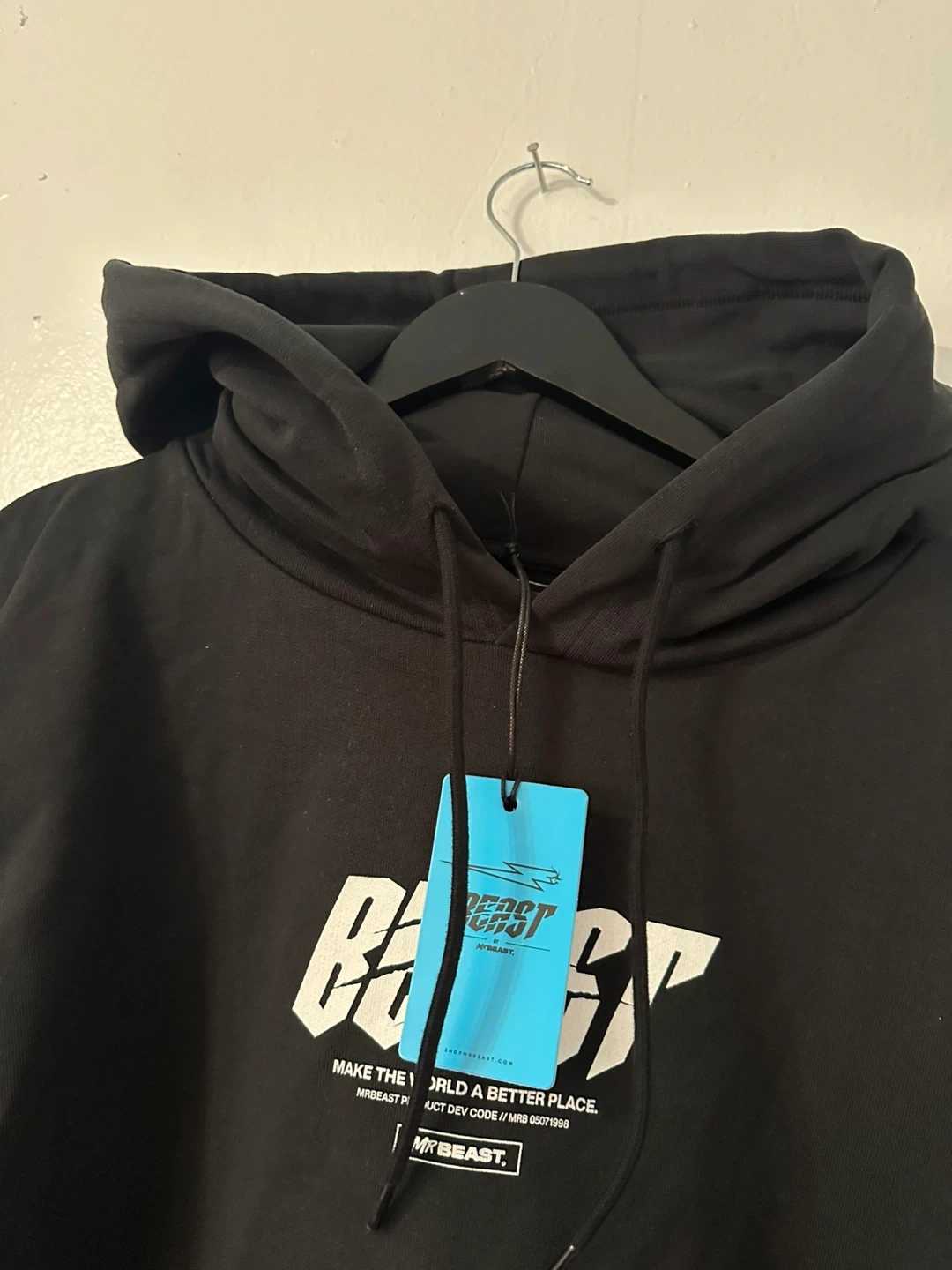 Selling a MrBeast black hoodie! It features the iconic 'BEAST' logo on the front and a small blue tag with the MrBeast logo on the bottom. It's in great condition and ready for a new home