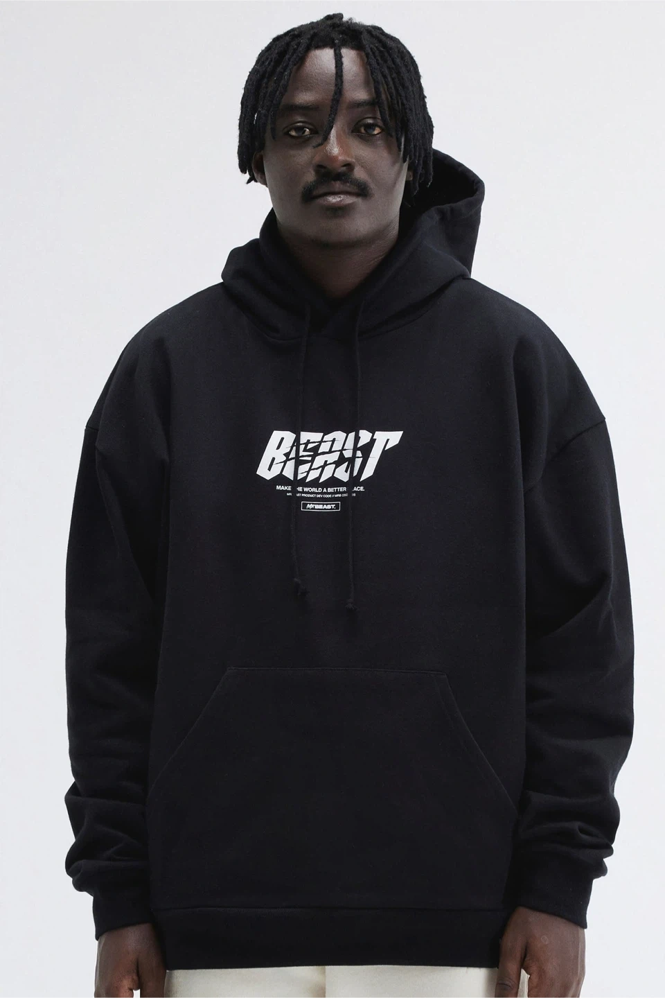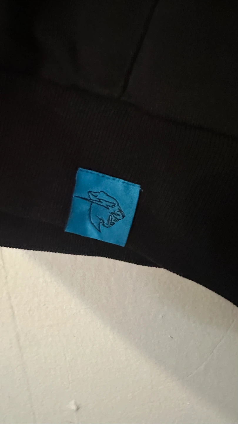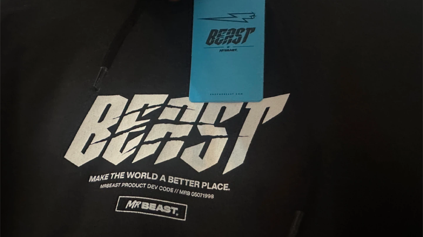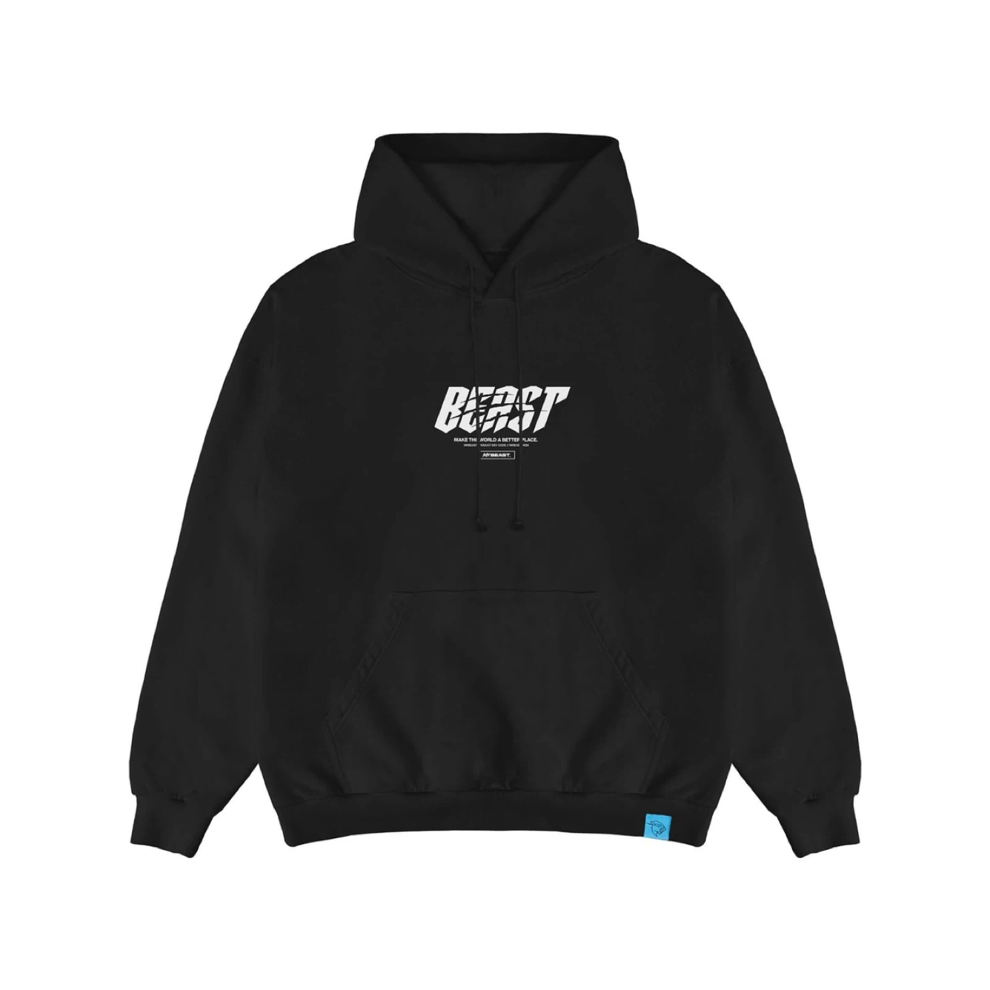 Selling a MrBeast black hoodie! It features the iconic 'BEAST' logo on the front and a small blue tag with the MrBeast logo on the bottom. It's in great condition and ready for a new home