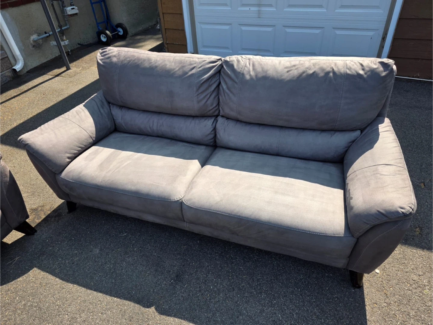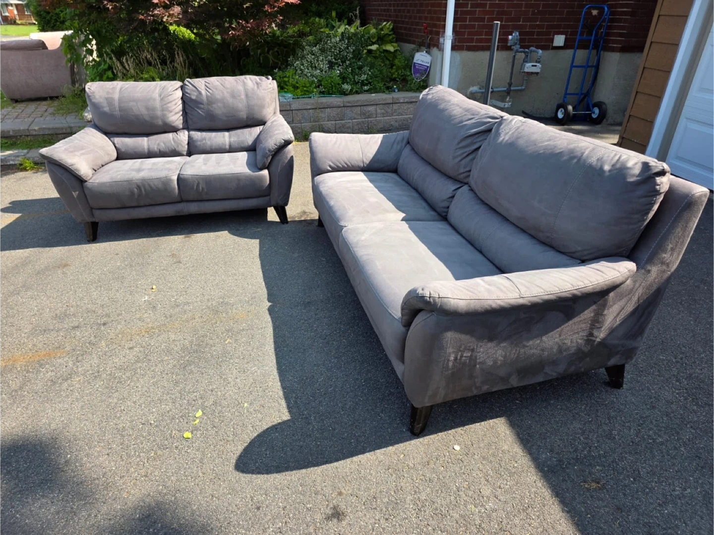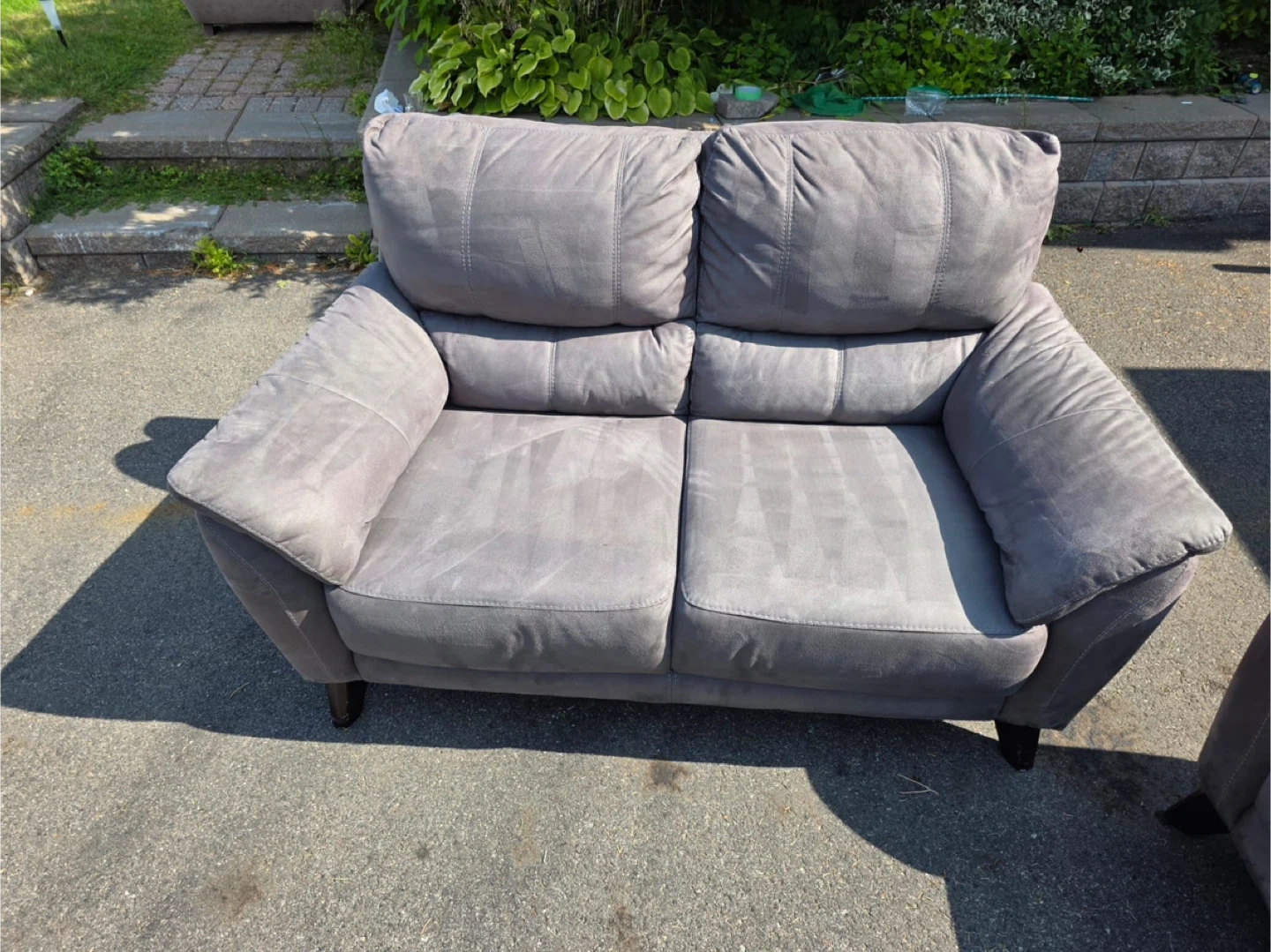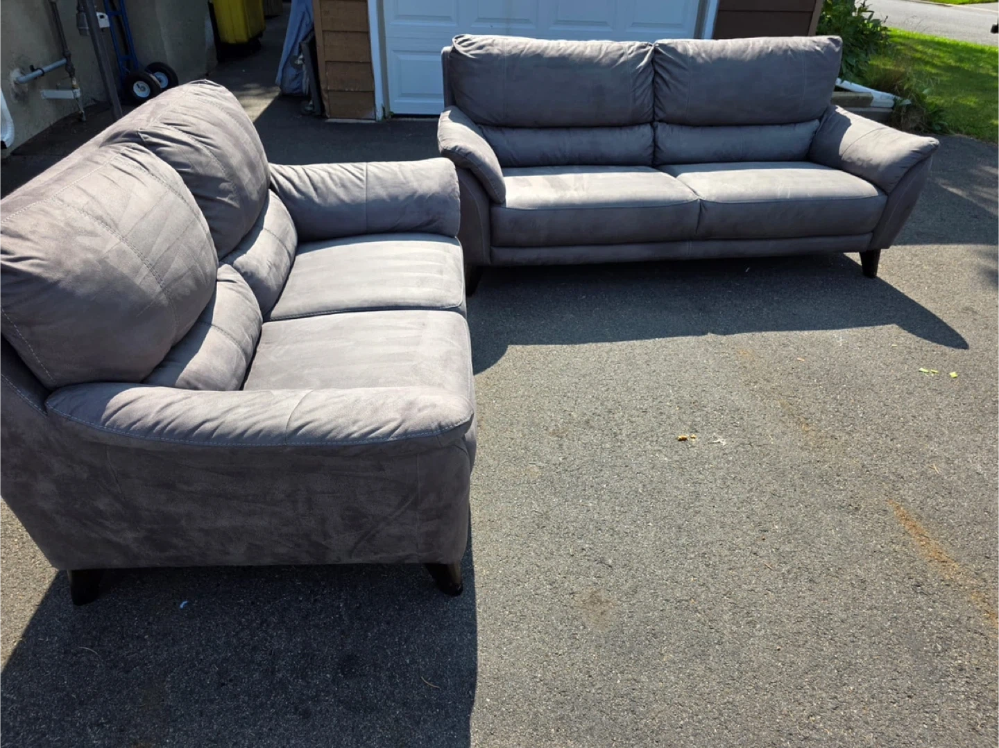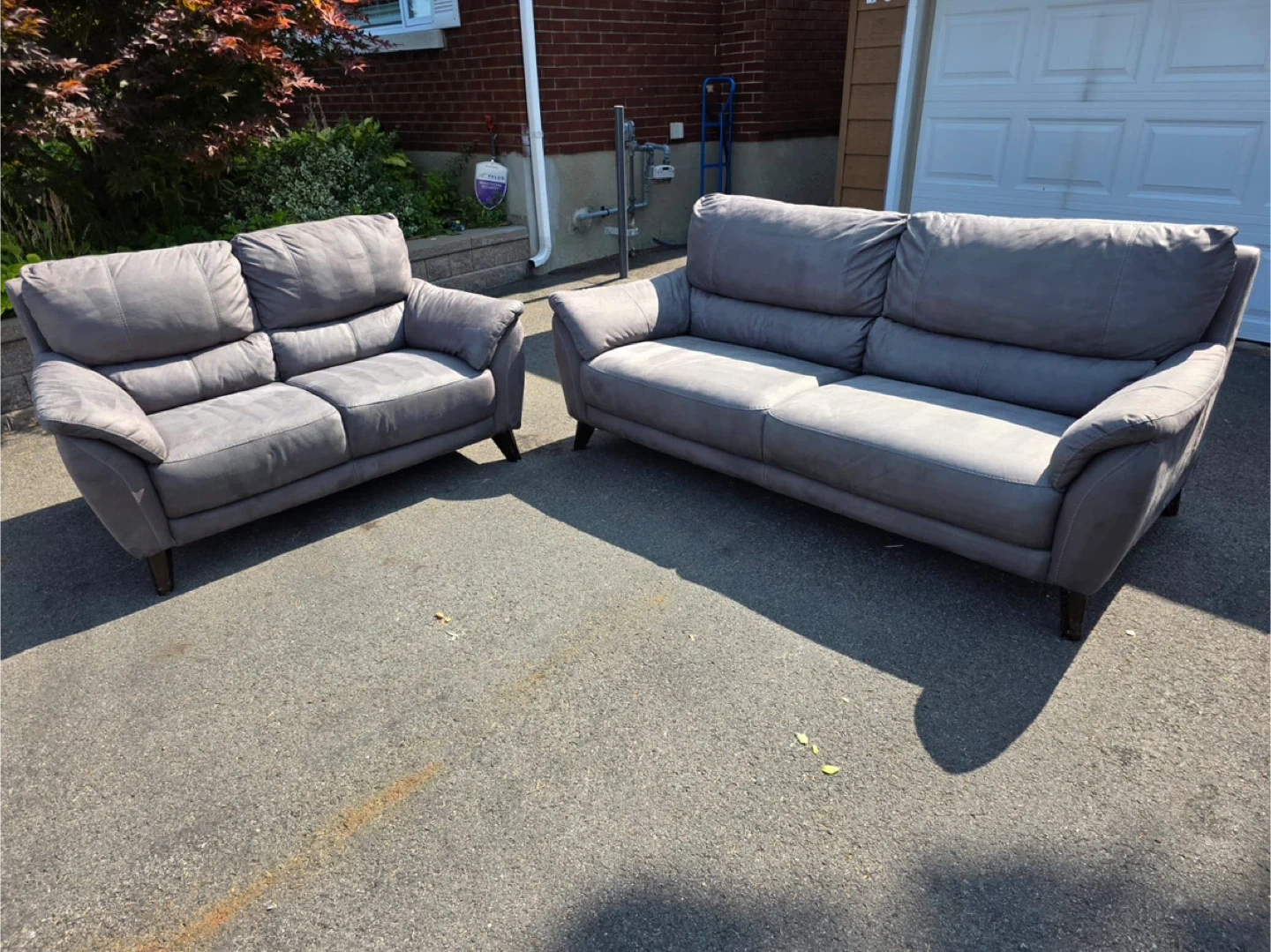 Selling a comfy sofa and loveseat set in a neutral grey colour! The set is in good condition and would be a great addition to any living room. Perfect for relaxing and watching movies or entertaining guests. The material is soft and inviting, making it a cozy place to unwind after a long day home delivery available