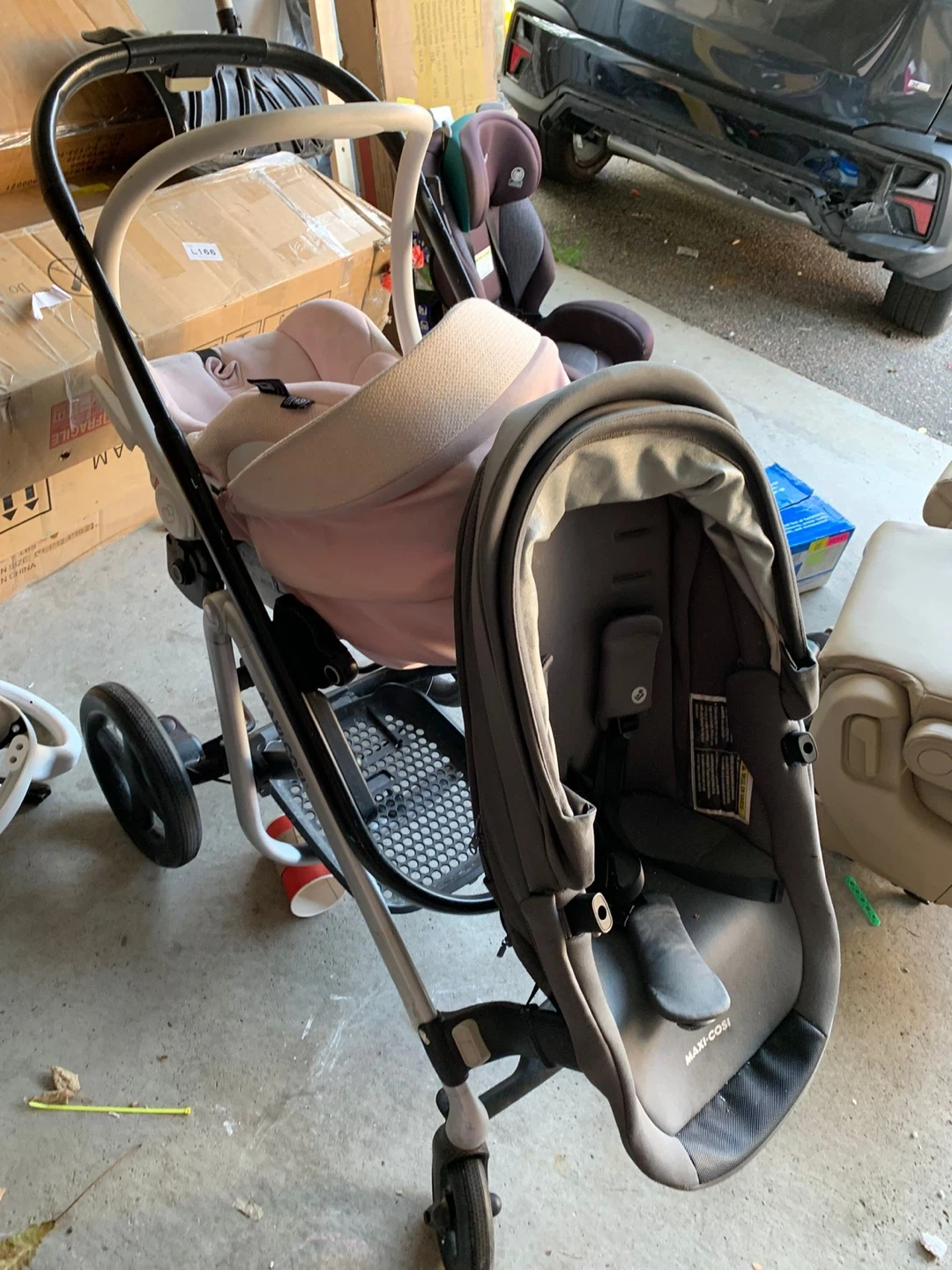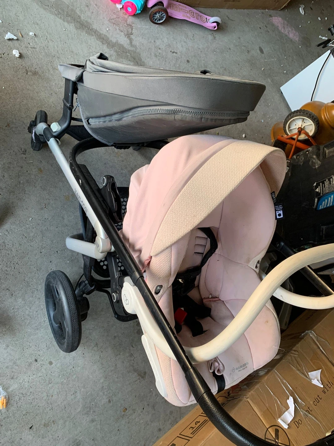 Selling a Maxi-Cosi stroller with a pink infant car seat and a grey toddler seat. Also included is an UPPAbaby Piggyback Ride Along Board. The stroller shows some signs of use, but is still in good working condition.