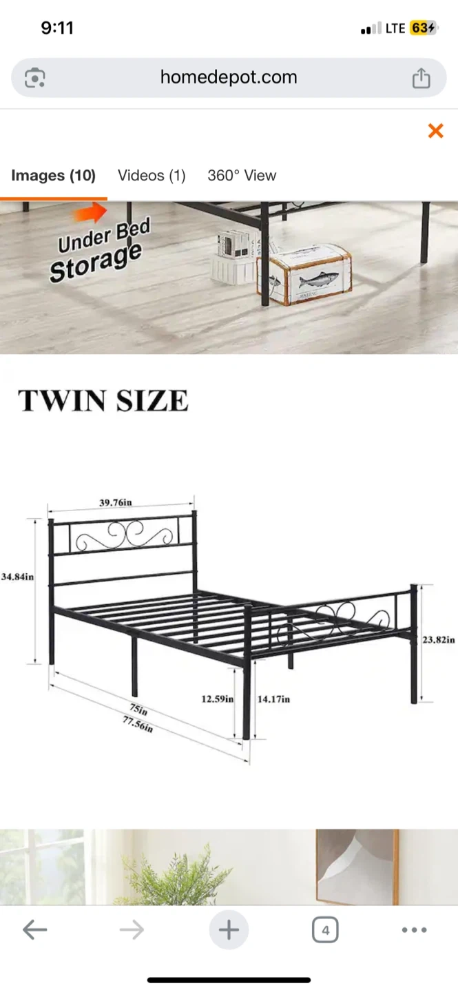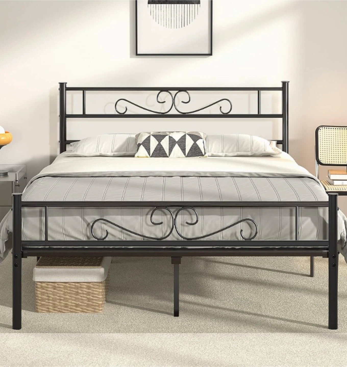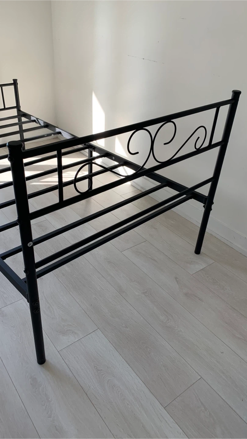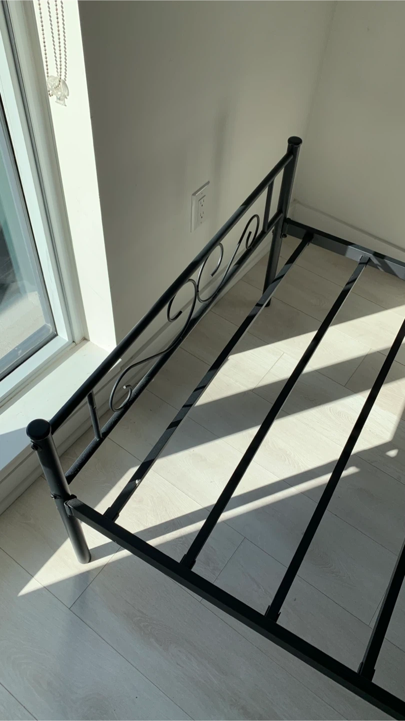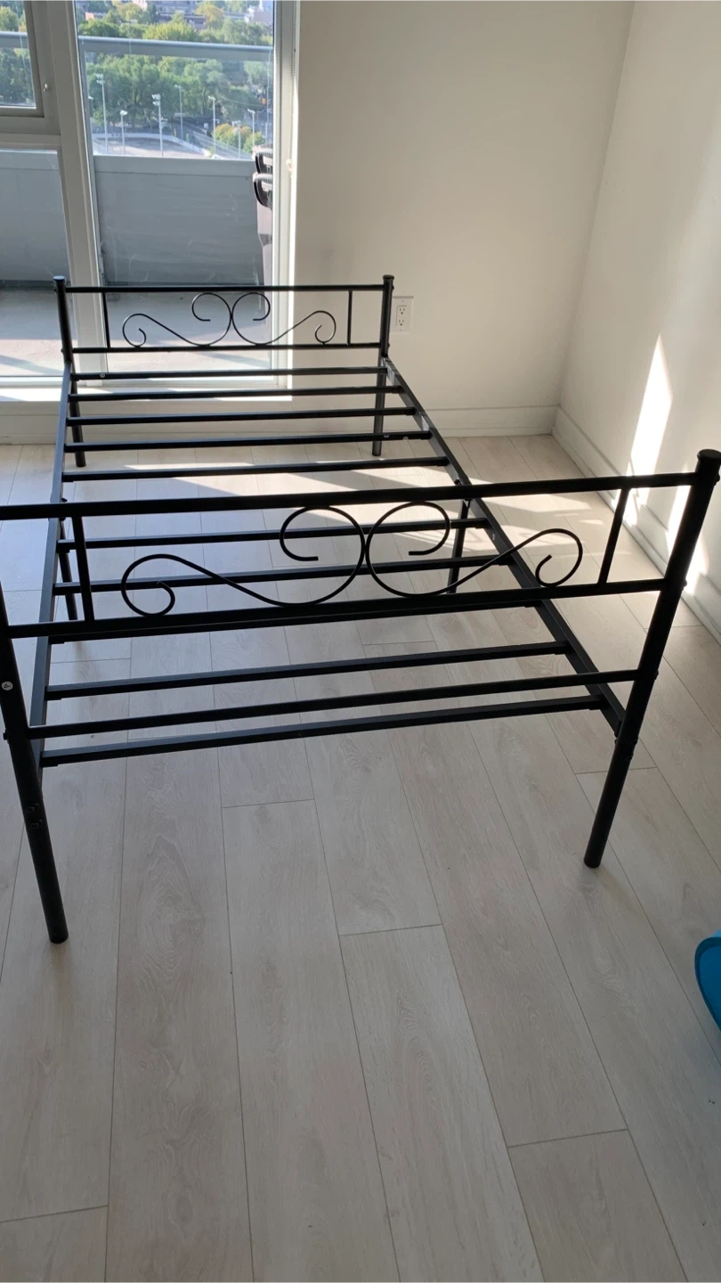 1000+Selling a black metal bed frame in twin size. It's in great shape and ready for a new home! The frame has a simple, elegant design that would fit well in any bedroom. Perfect for a guest room or a small space.